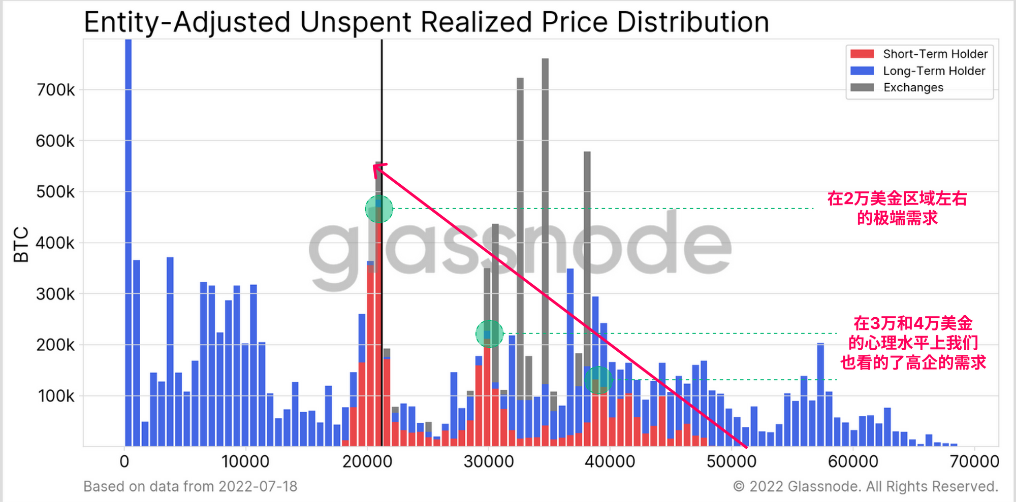 - 短期持有人的需求节点也可以在$4万、$3万和$2万的心理价位上看到。值得注意的是,尽管价格比购买价低50%以上,这些供应(包括上面的LTH供应)还没有投降。这很可能说明了比特币被那些对价格相对不敏感的买家所持有。