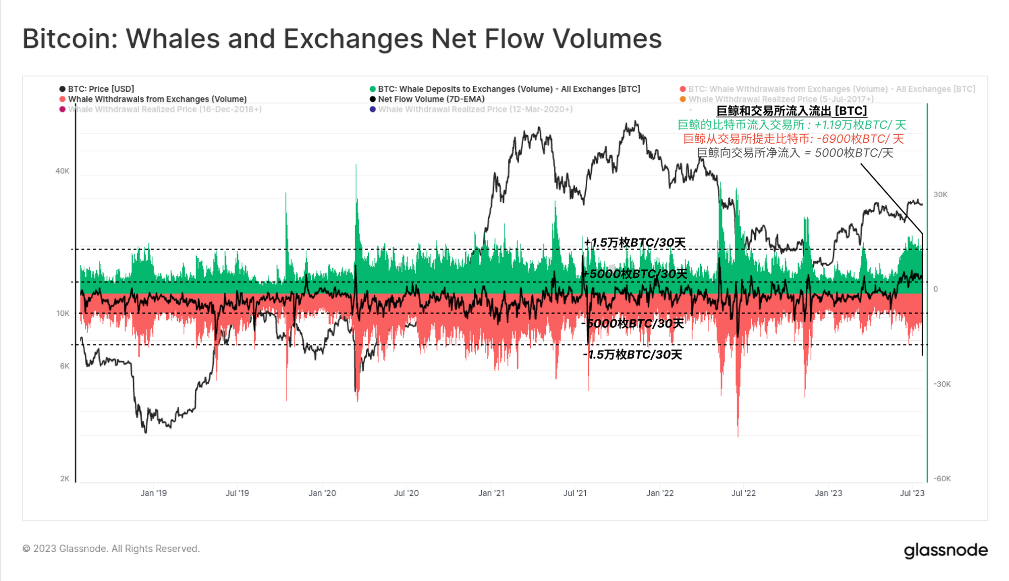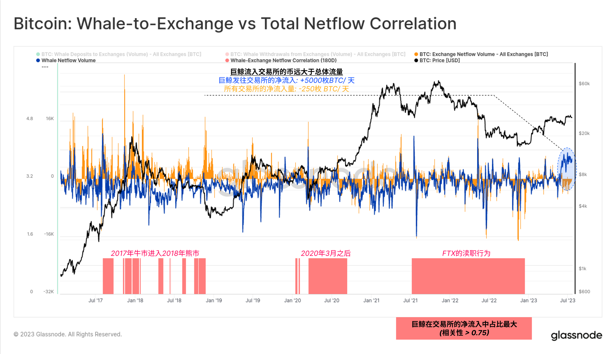 考虑到巨鲸的行为,我们现在可以尝试观察其对市场的影响,重点是交易所。下图可用于通过两种痕迹分析巨鲸实体与交易所之间的关系: