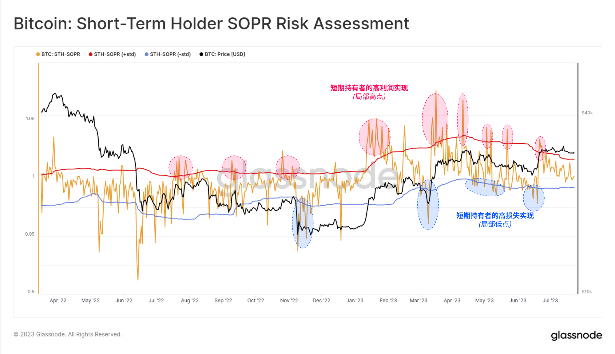 短期持有者 SOPR 是另一个强大的工具,可为现货市场的这种本地交易行为提供汇合点。SOPR这个指标跟踪短期持有者的平均卖出价格(处置价格)与购买价格之间的比率。