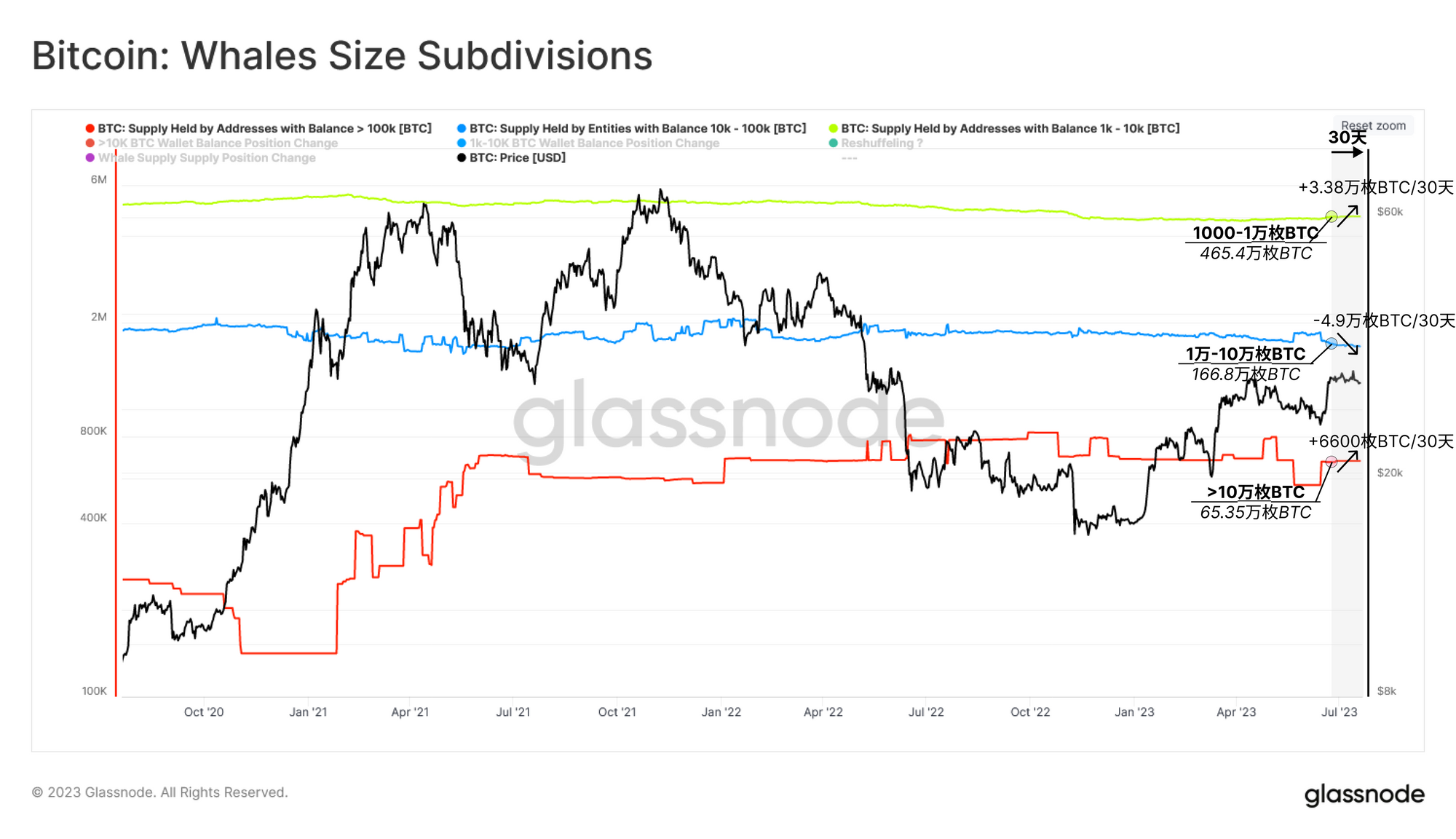 为了探索巨鲸群内部的分化,我们可以观察每个子群在过去 30 天内拥有的供应量的变化: