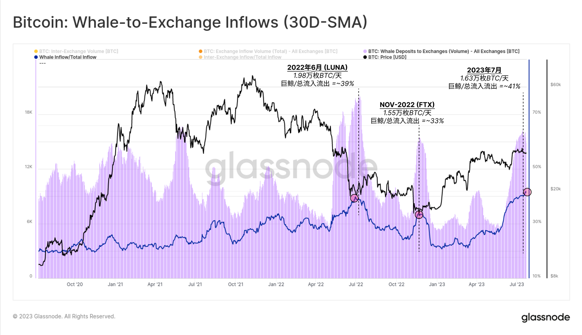在最近的反弹中,巨鲸流入交易所的数量显著增加,达到每天1.63万枚比特币。巨鲸占所有交易所流入量的比例为41%,与LUNA崩溃时的情况(39%)和FTX失败时的情况(33%)相当。