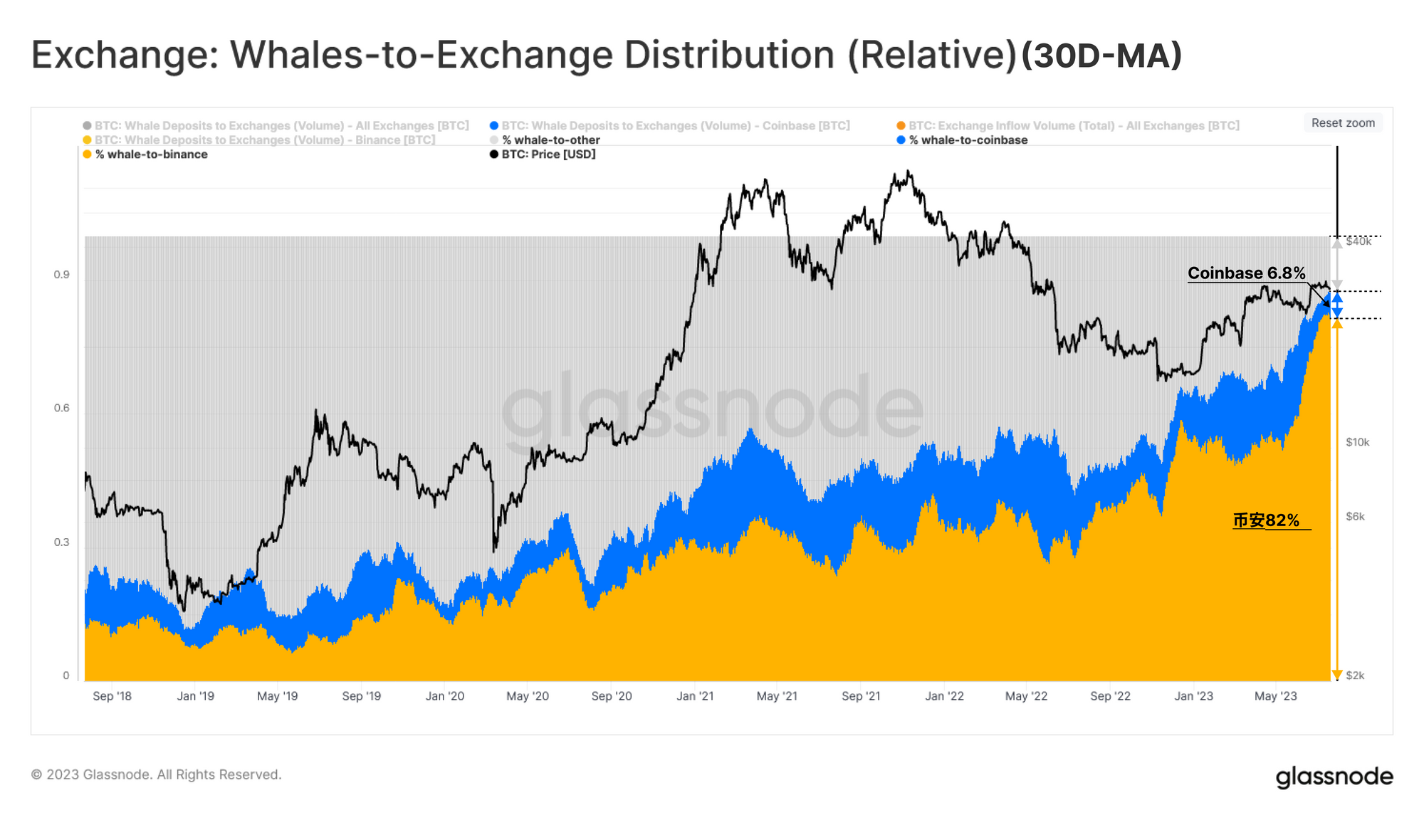 比特币的巨鲸实体经常被认为是影响市场价格走势的关键因素。虽然跟踪和监控这些实体相当具有挑战性,但近几个月来它们似乎越来越活跃。特别是,42%的交易所资金流入与巨鲸实体有关,其中绝大多数流入币安。