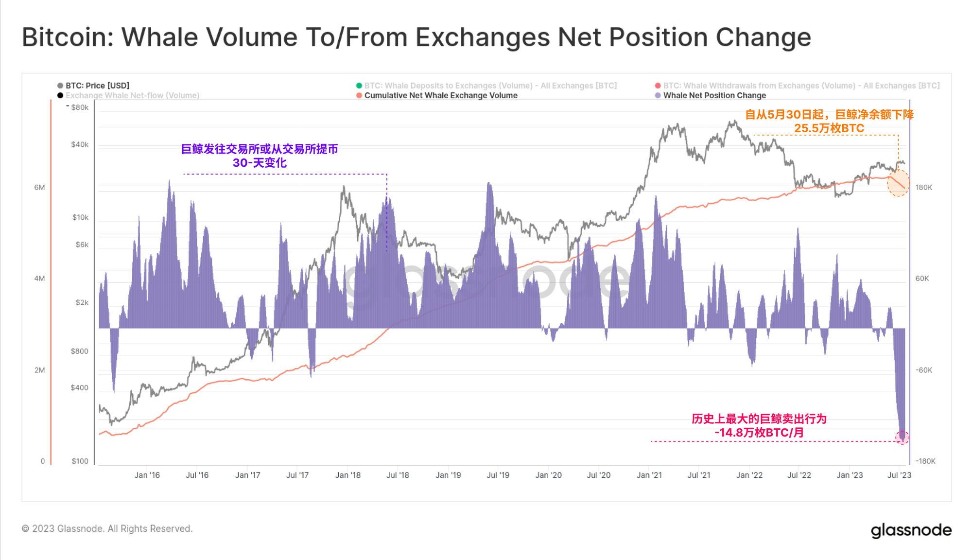 为了从数据集中剔除交易所,我们可以只分离出在比特币巨鲸实体和交易所之间流动的比特币。下图显示,自 5月30日以来,巨鲸总余额减少了 25.5万枚BTC。