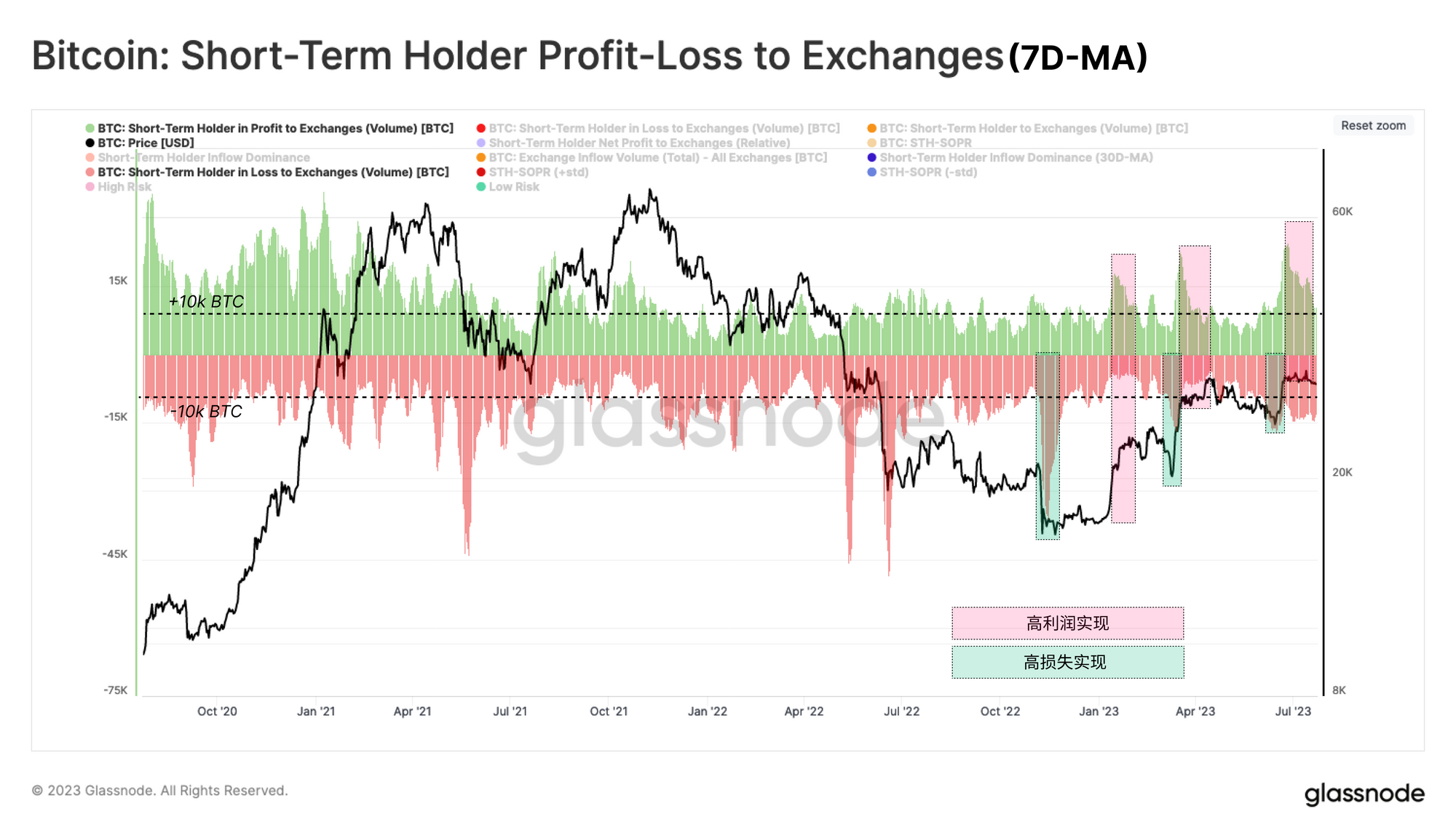 如果我们看看流入交易所的短期持有者交易量所实现的盈亏程度,就会发现这些新晋投资者是在交易当地市场状况。自FTX暴跌以来,每次反弹和回调,STH 盈利或亏损都会分别上升1万枚比特币。