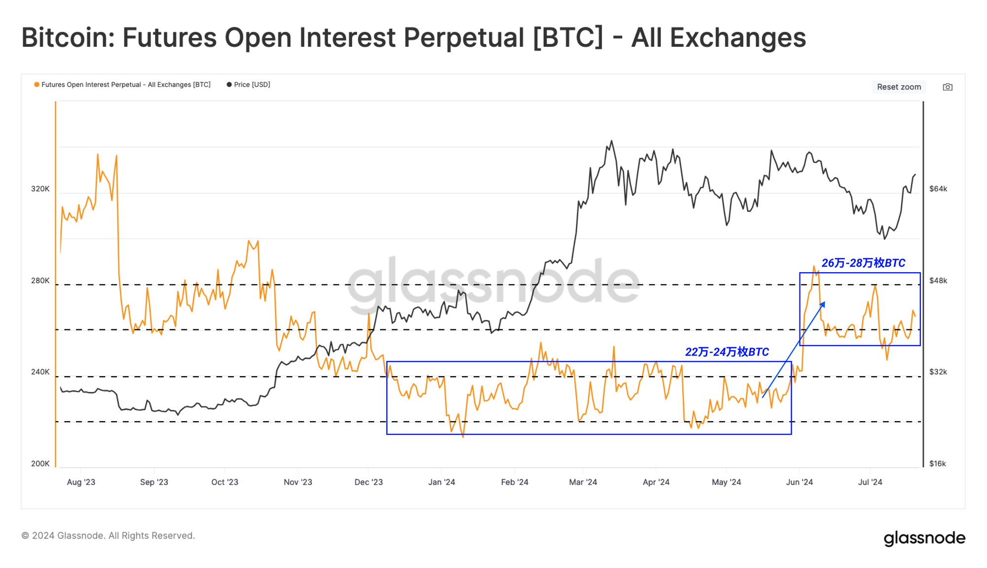 在2024年,永续期货的未平仓合约在22万至24万枚BTC之间波动。在去杠杆化事件期间,这一数值通常迅速下降,而在投机性较强的时期则上升。最近,未平仓合约已上升至26万至28万枚BTC范围,这表明自六月初以来投机需求增加。