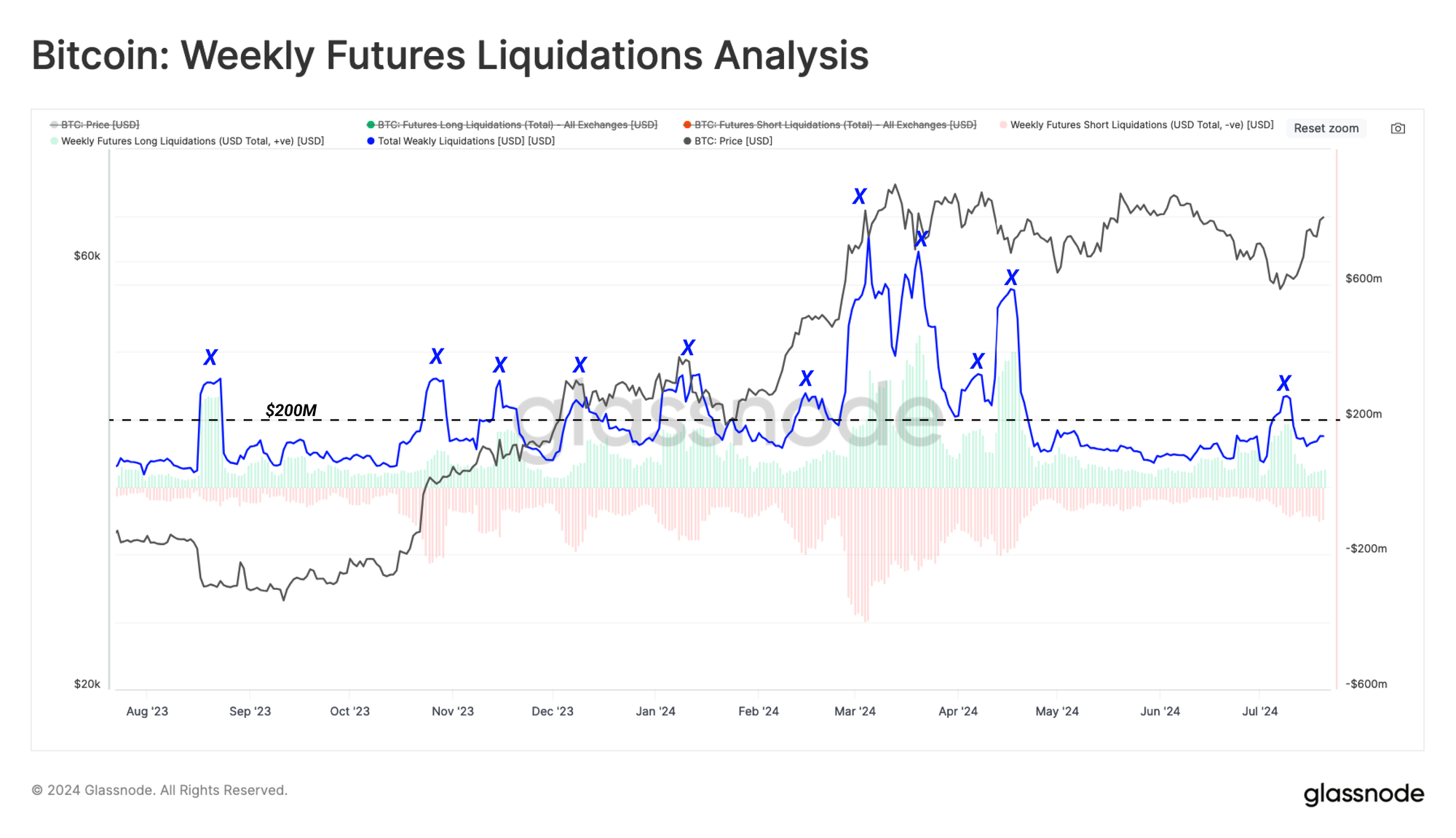 最近从5.4万美元区域的反弹是一个很好的例子,显示了过度杠杆的多头头寸在接近本地低点时被清算。资金费率低于0.01%的中性水平,表明自7月低点确立以来,没有出现新的多头头寸开立的急迫性。