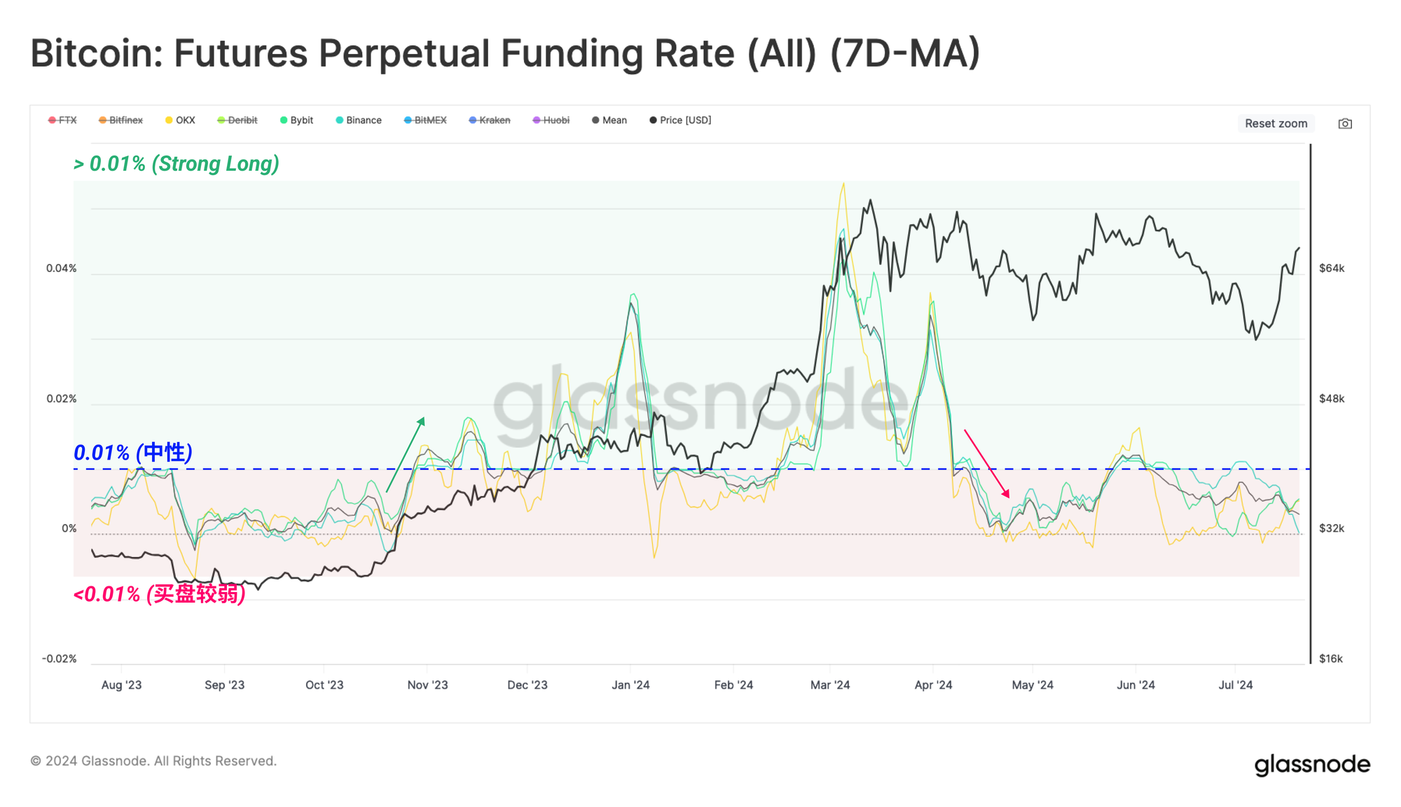 这是一个非常有洞察力的指标,提供了关于永续市场内头寸方向偏差的信息。当每周平均资金费率高于中性水平(0.01%每8小时)时,这表明市场买家对开立多头头寸的需求很大。