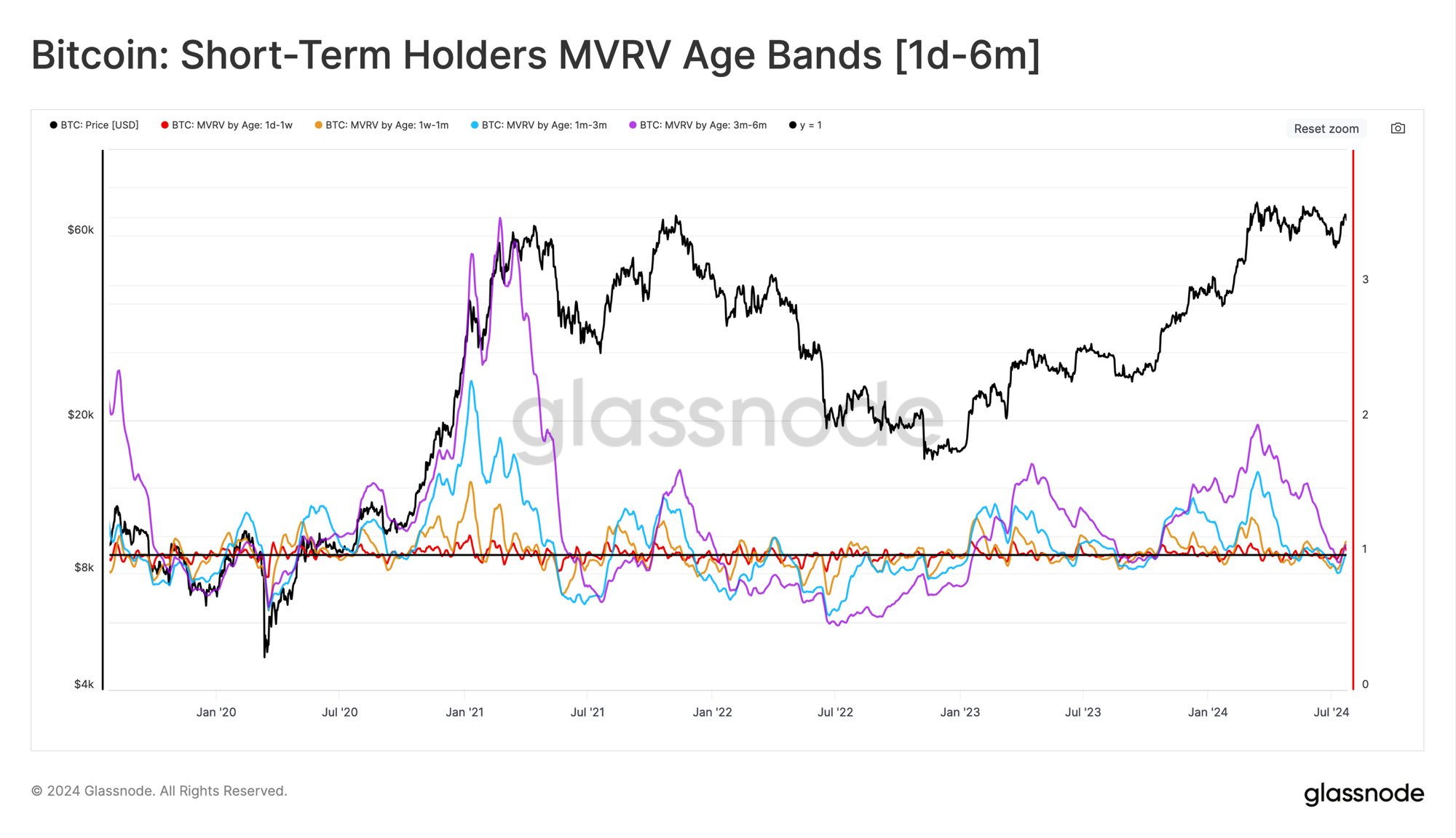 通过检查短期持有者MVRV指标的个别年龄细分,我们可以增加这一评估的细致程度。我们可以通过这个视角看到各子群体的盈利能力变化。我们分析的年龄范围从非常近期的买家(1天至1周)到即将过渡到长期持有者状态的买家(3到6个月)。