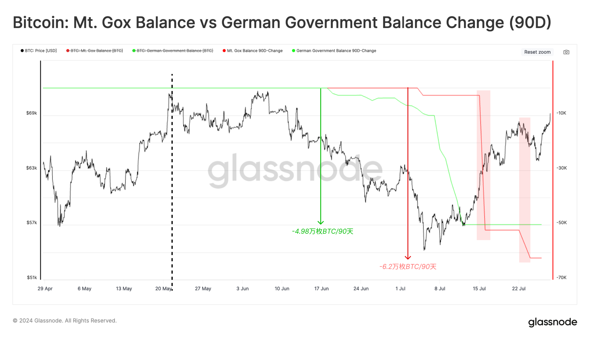 六月底德国政府的卖方压力非常大,在一个月内卖出了超过4.8万 枚比特币。尽管如此,市场吸收了这一供应,并在此后不久从5.3万美元反弹至超过6.8万美元。