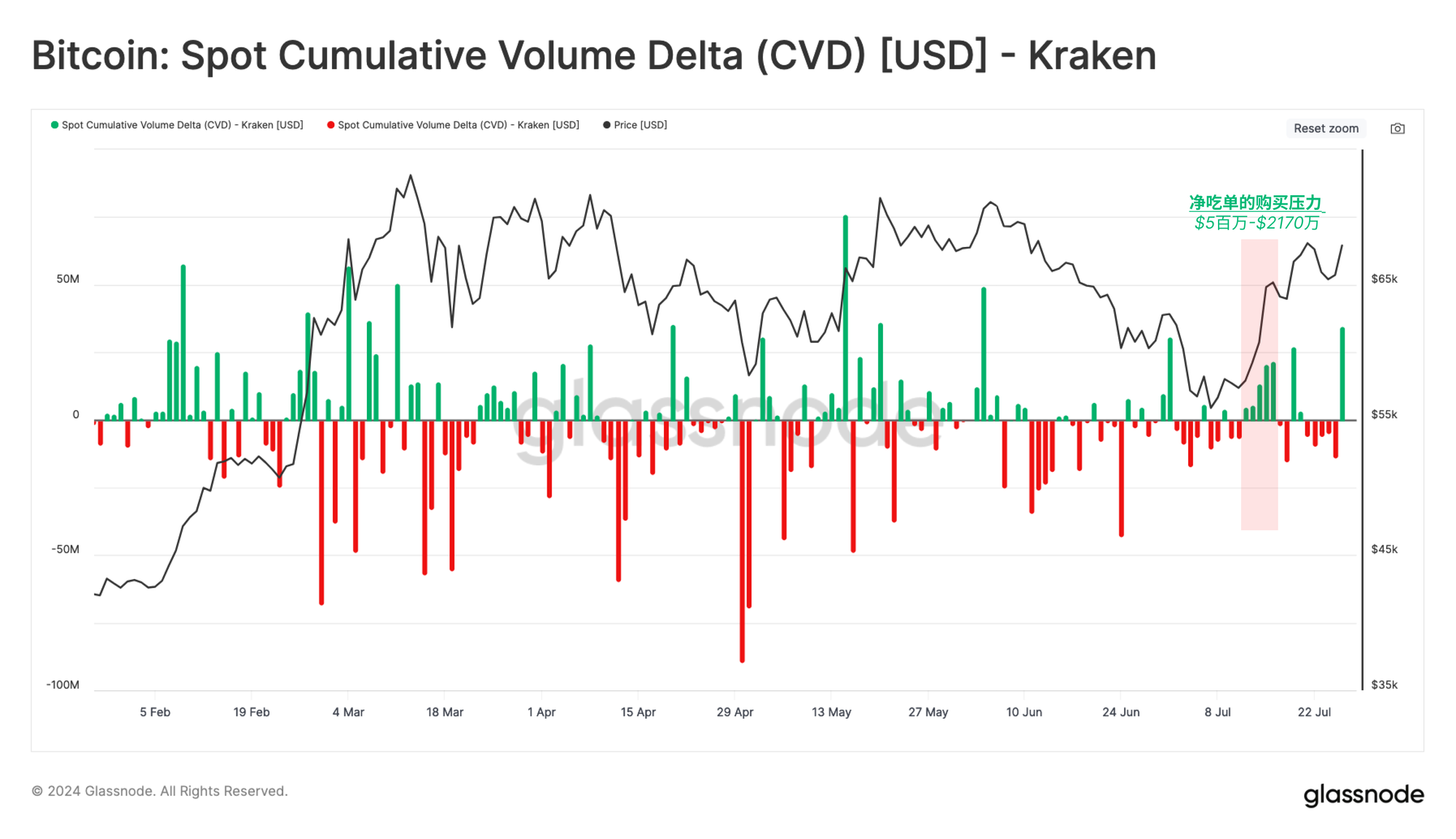 CVD测量的是中心化交易所(仅限市场订单)上的现货买入和卖出交易量的净差。