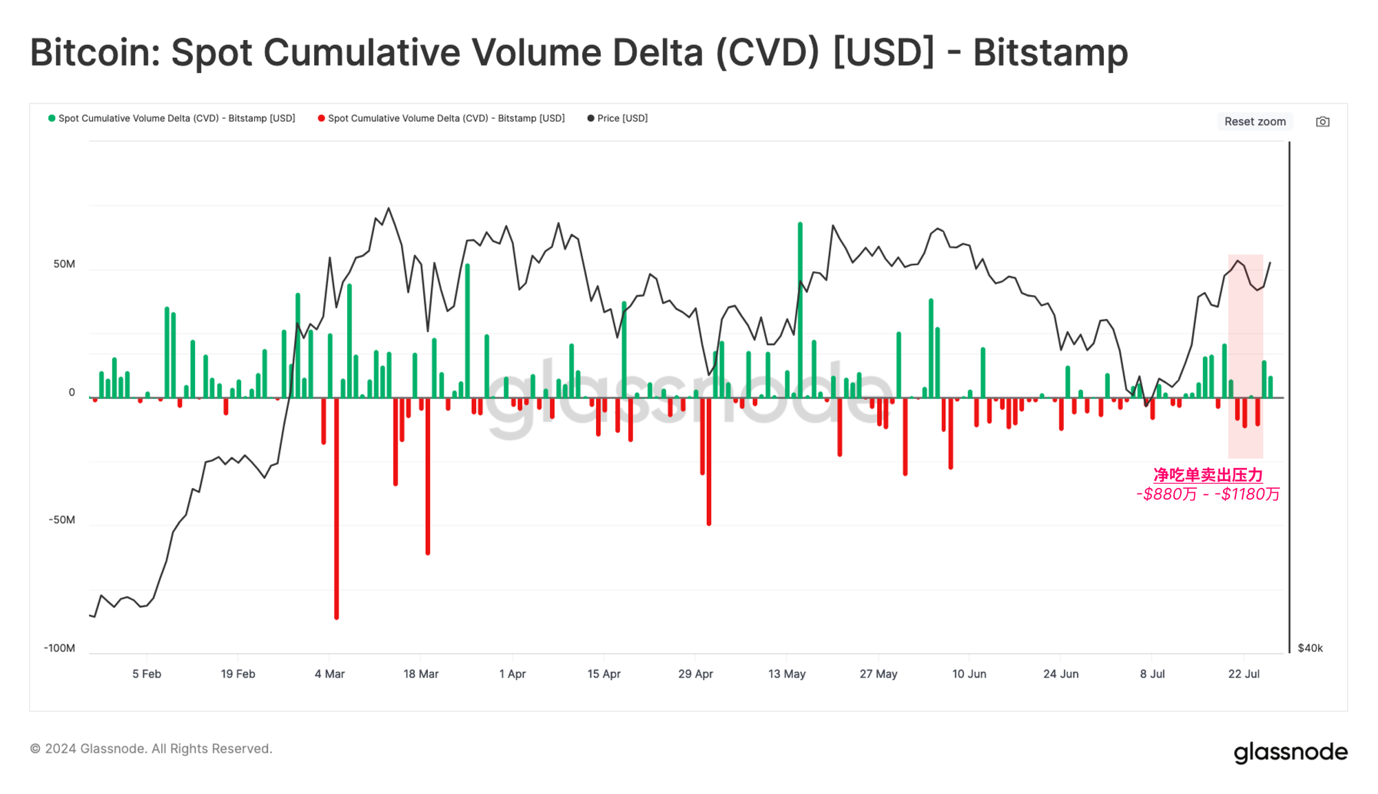 了解到Kraken和Bitstamp是重新分发币的目的地交易所,我们可以利用现货累计成交量差(CVD)指标来进一步了解这一点。