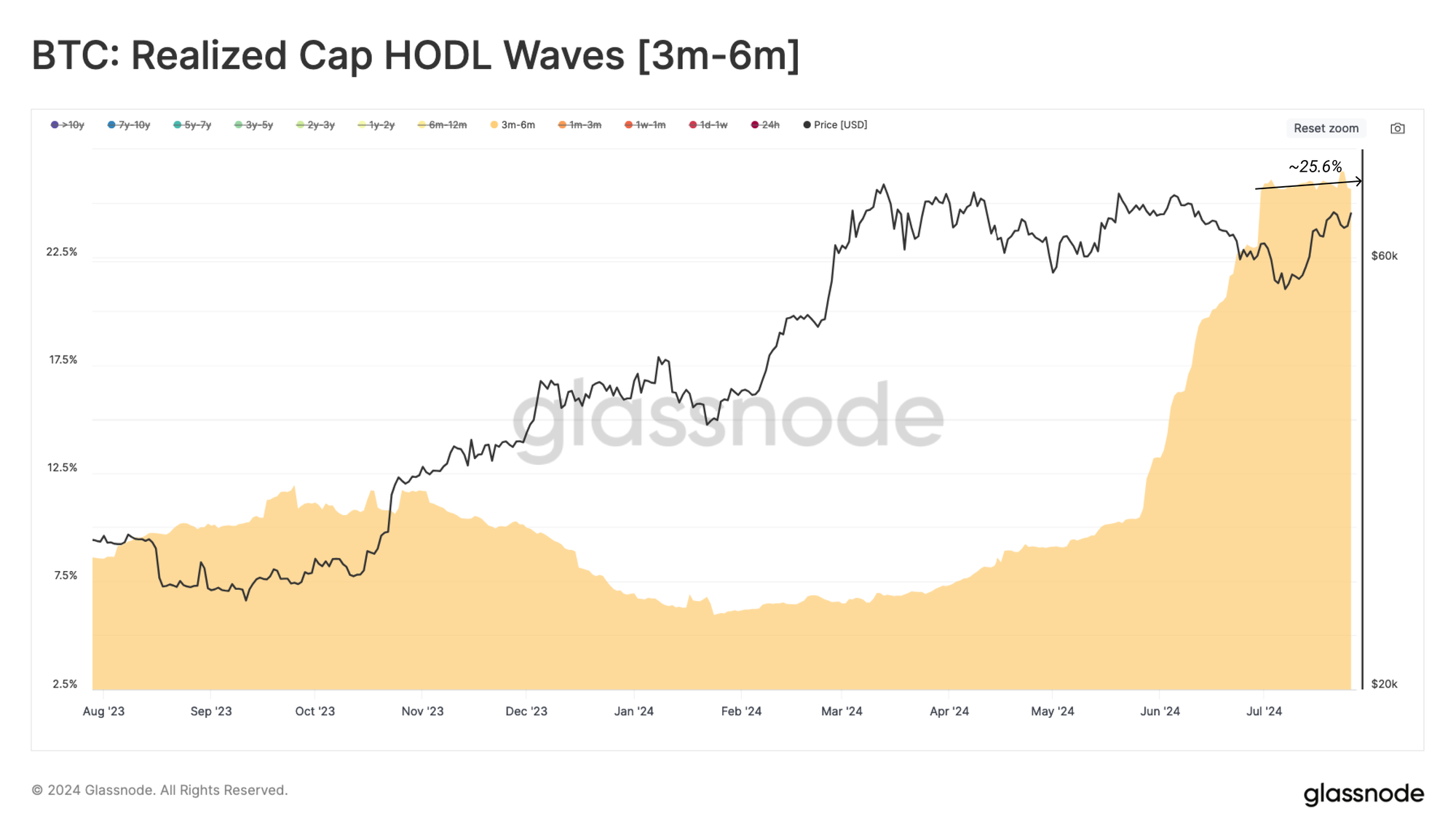 已实现市值HODL波指标帮助我们区分持有不到三个月的币的美元财富。这使我们能够评估新投资者流入需求的波动。