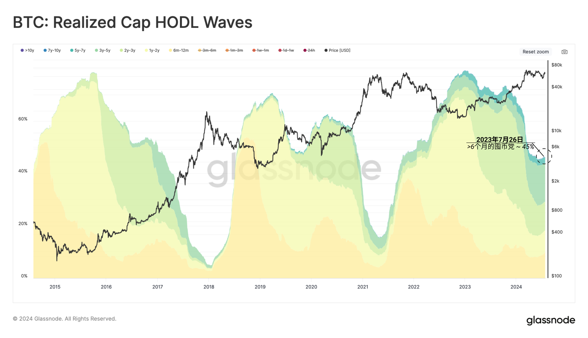 长期投资者目前持有45%的网络财富,这一比例相较于宏观周期顶部事件时相对较高。这强调了长期持有者以囤币持有模式持有币,耐心等待更高的价格以在市场强势时出售。