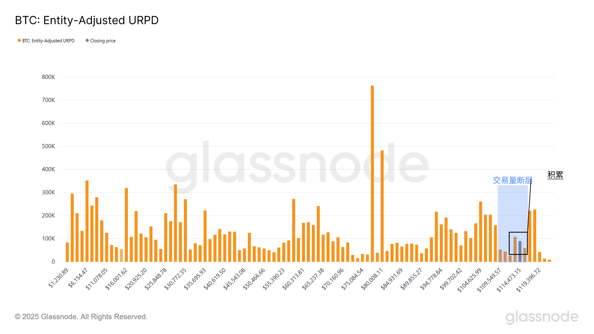 UTXO已实现价格分布(URPD)展示了截至特定日期的比特币UTXO创建位置,每个柱状条表示最后一次在特定价格区间发生转移的供应量。
