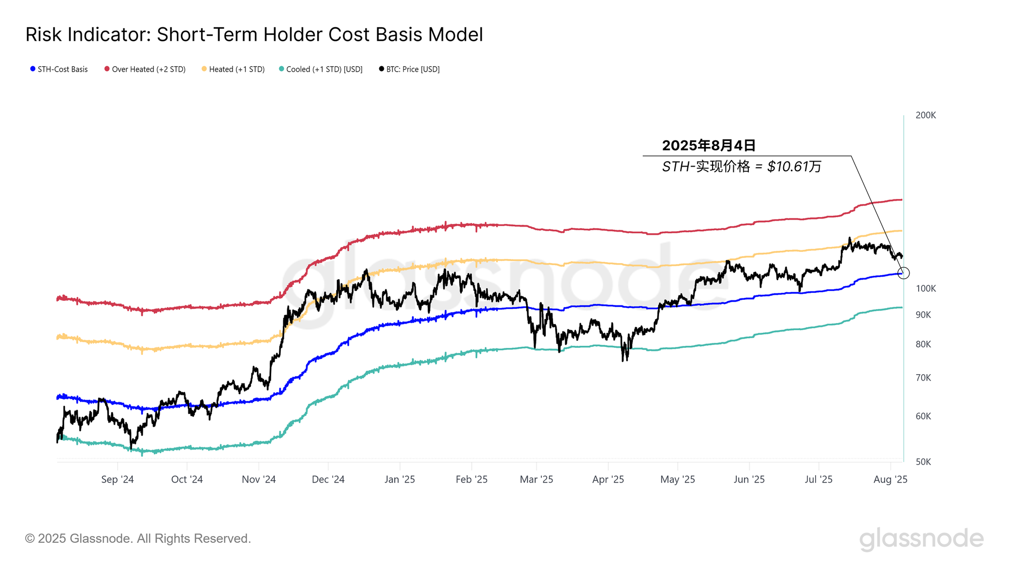 当前比特币价格位于“温热”区间内,尚未过热,并且仍处于短期持有者成本价(106,000美元)之上。这种状态在比特币牛市中非常常见,而短期持有者成本价在历史上往往是划分短期牛市与熊市趋势的重要门槛。