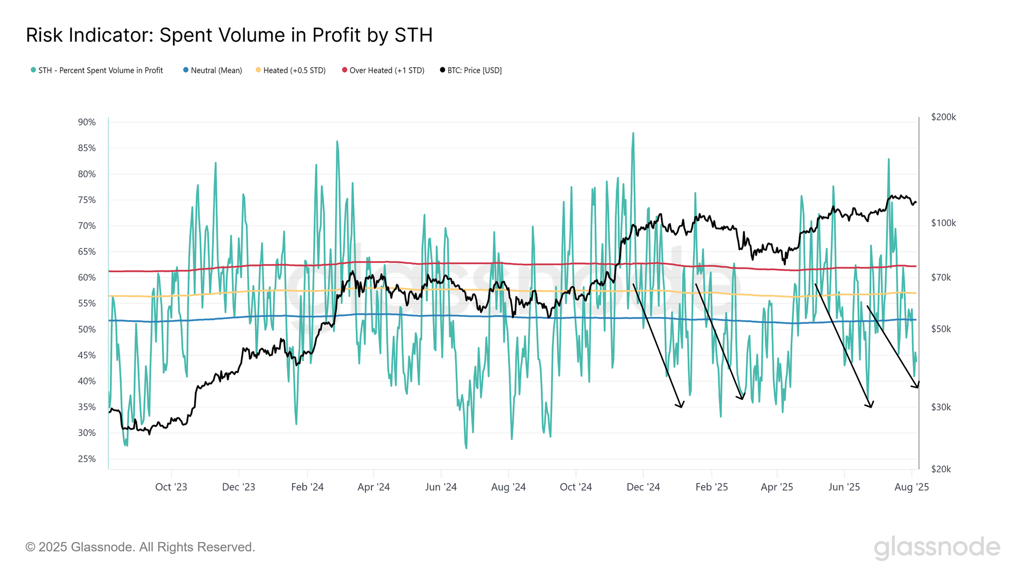 短期持有者中处于盈利状态并选择卖出的比例正在回落,目前为45%,低于中性阈值。