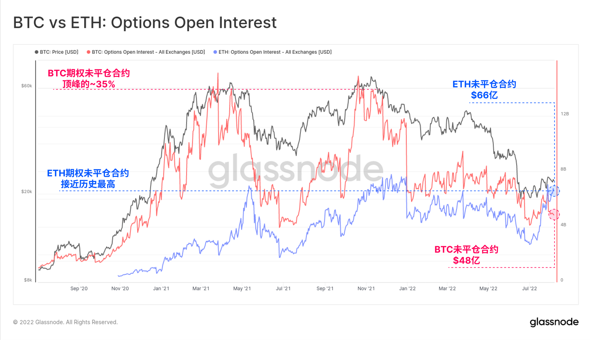 然而,在另一方面,衍生品交易商正在为以太坊赌下明显的方向性赌注,特别与9月19日进行的合并计划有关。当前以太坊期权未平仓合约为66亿美元,这比比特币的48亿美元还要高,属于历史上头一次。