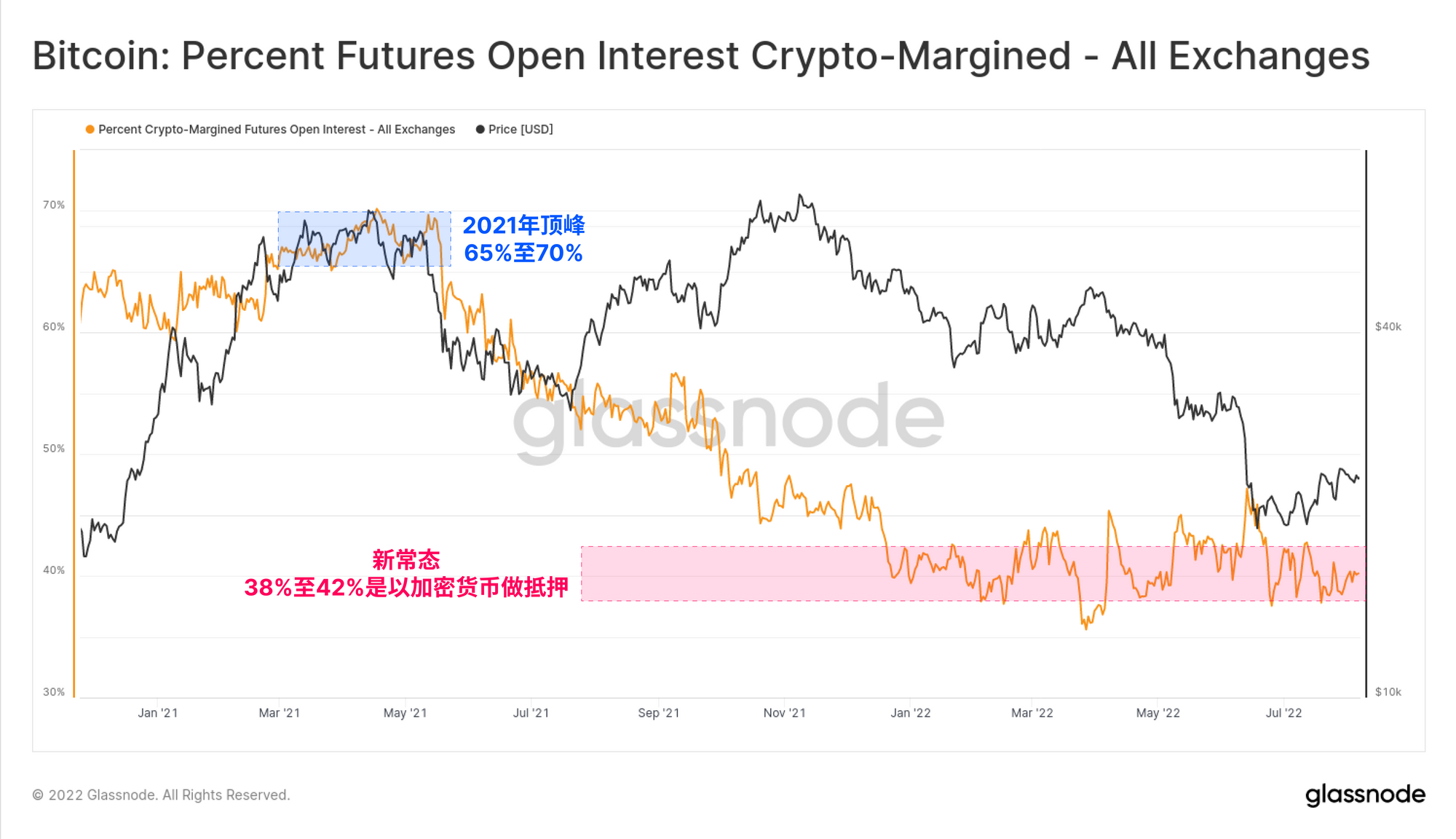 比较以比特币定价的未平仓合约,有助于我们将期货杠杆的增长期与币价变化分开。按美元计算,目前的未平仓合约总额为124亿美元,相对较低,相当于2021年1月的早期牛市,以及2021年6月的2.9万美元抛售低点。