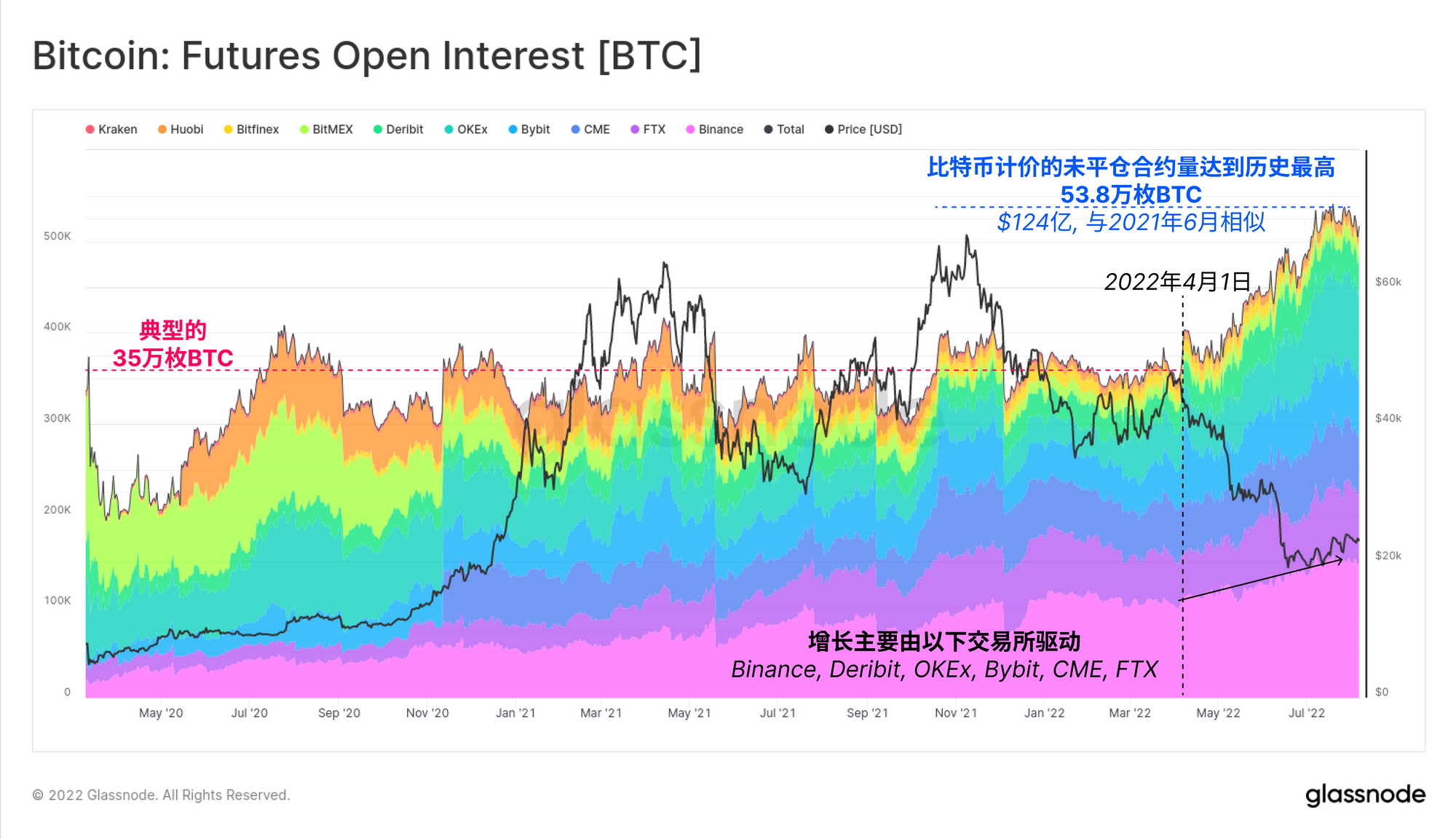 自四月初以来,比特币期货市场的未平仓合约大幅增加,脱离了约35万枚比特币的基线,达到了53.8万枚比特币的新高。增长是由少数几个交易所驱动,主要是Binance、Deribit、OKEx、Bybit、FTX和CME。