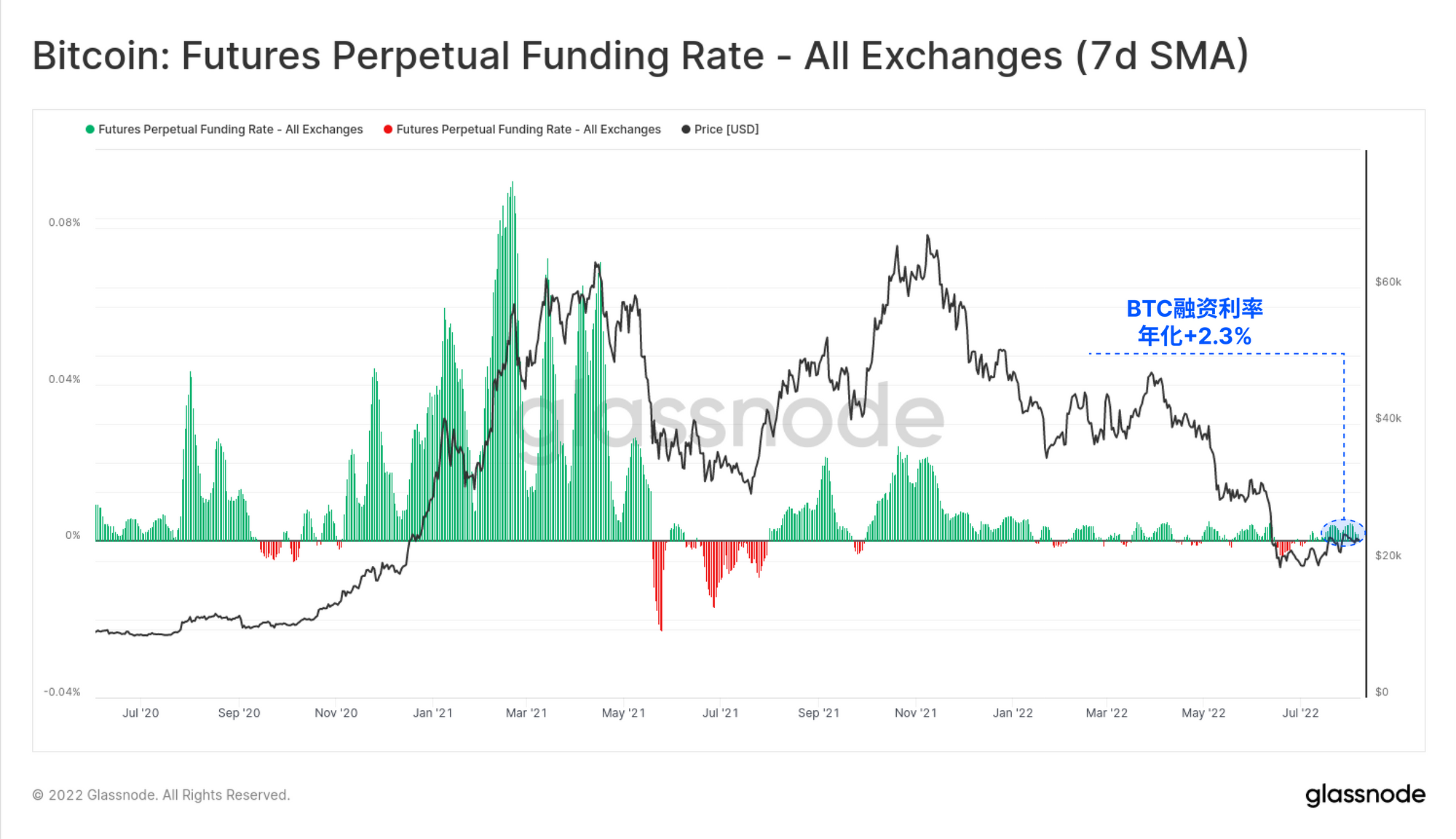 警示想法资金利率(7D SMA) 向下突破0将预示当前溢价的负面逆转,向上突破0.005%将预示着投机性溢价的增加。