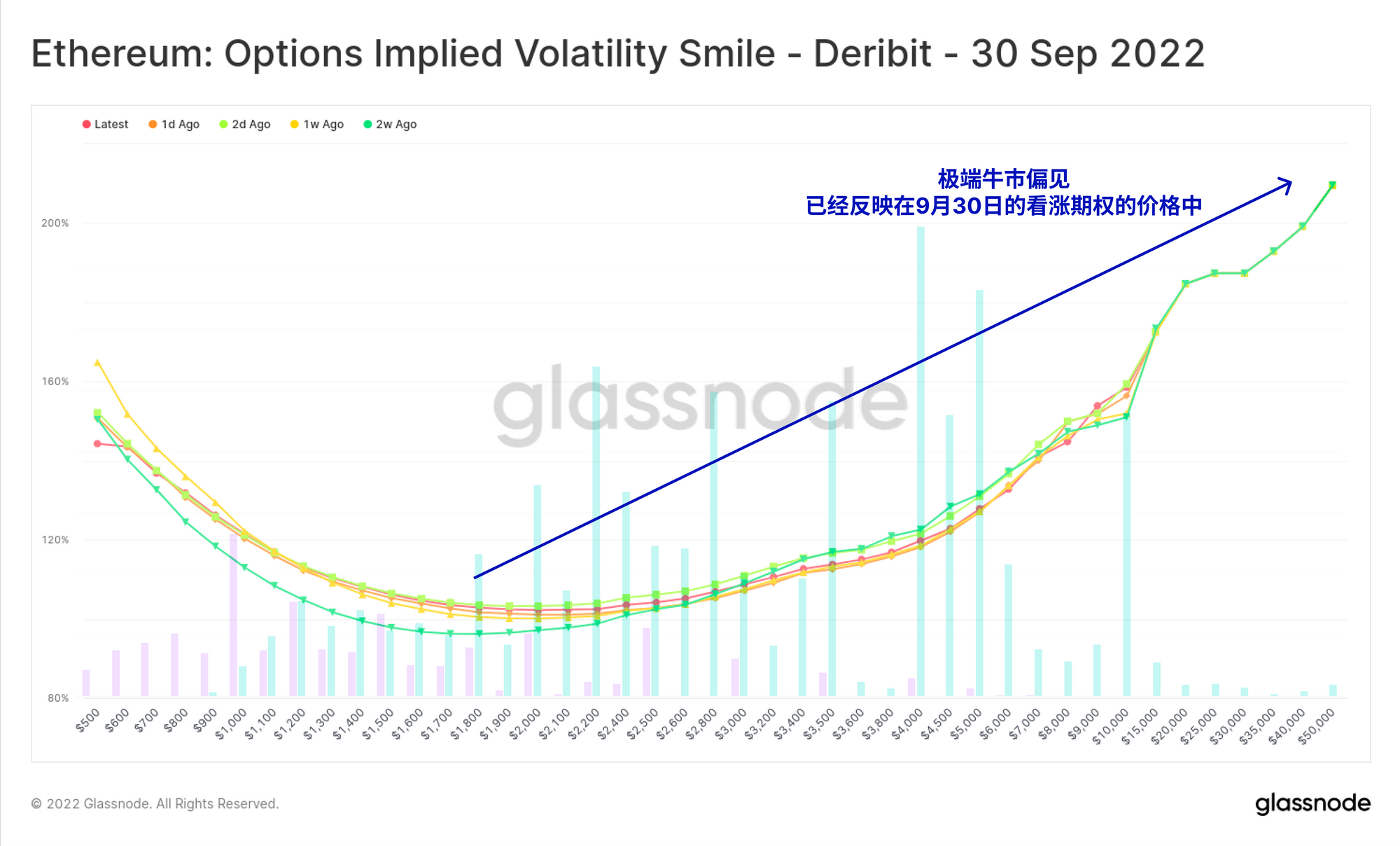 这种对9月到期的ETH看涨期权的大量买入需求,将波动率微笑推到了一个极端看涨的状态。覆盖在该图表上的是未平仓合约,可以看出,上升的斜率主要是由愿意为多头看涨期权支付溢价的交易商推动的。