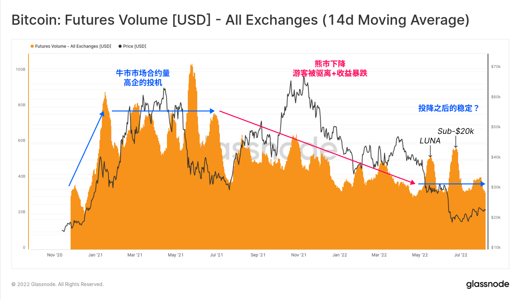 在LUNA崩溃之后,期货交易量似乎已经稳定下来。自2021年5月抛售以来的12个月中,交易量经历了结构性下降,但似乎正在重新建立一个底线,大约为330亿美元/天。