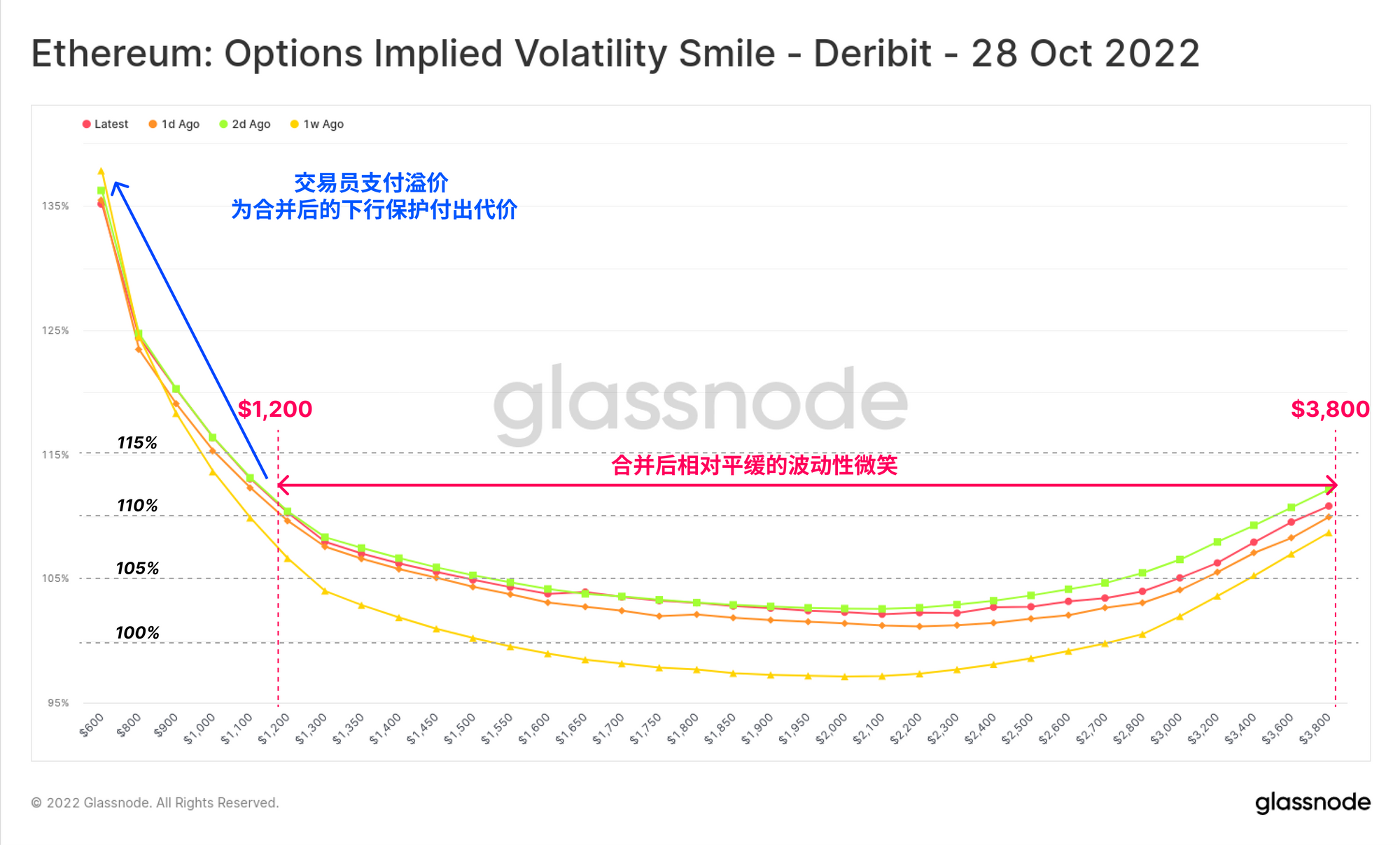 如果我们将9月波动率微笑的形状和规模与10月进行比较,我们可以看到右边尾部的急剧下降,形状相对平坦,整个曲线的隐含波动率低于110%。这表明在合并事件之后,对通过期权创建以太坊敞口的需求相对较低。