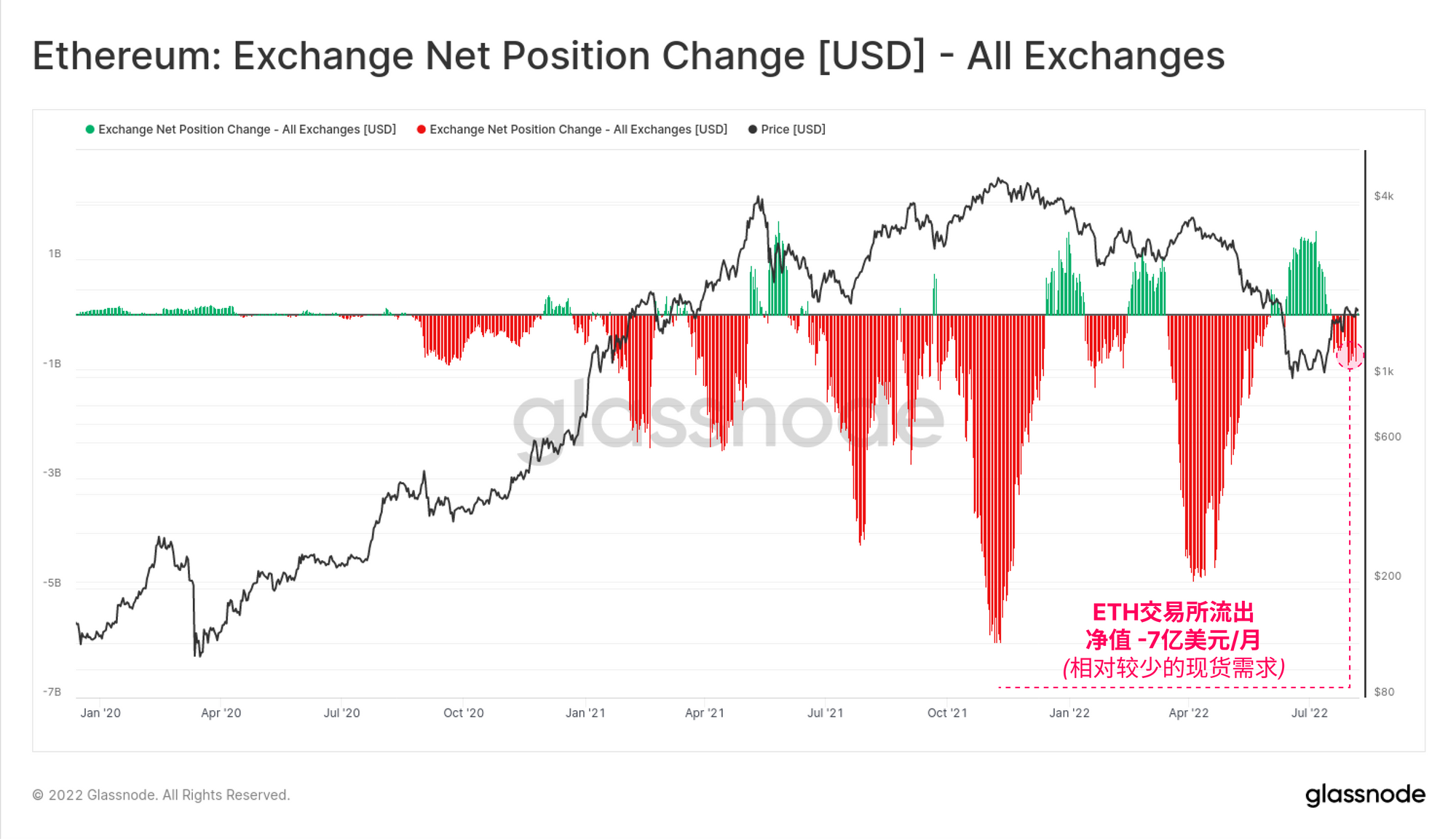 鉴于以太坊期权市场的强烈看涨倾向,预计现货需求将相当强劲。然而,观察一下交易所的净头寸变化,就会发现每月从交易所体总的净资金只有-7亿美元。