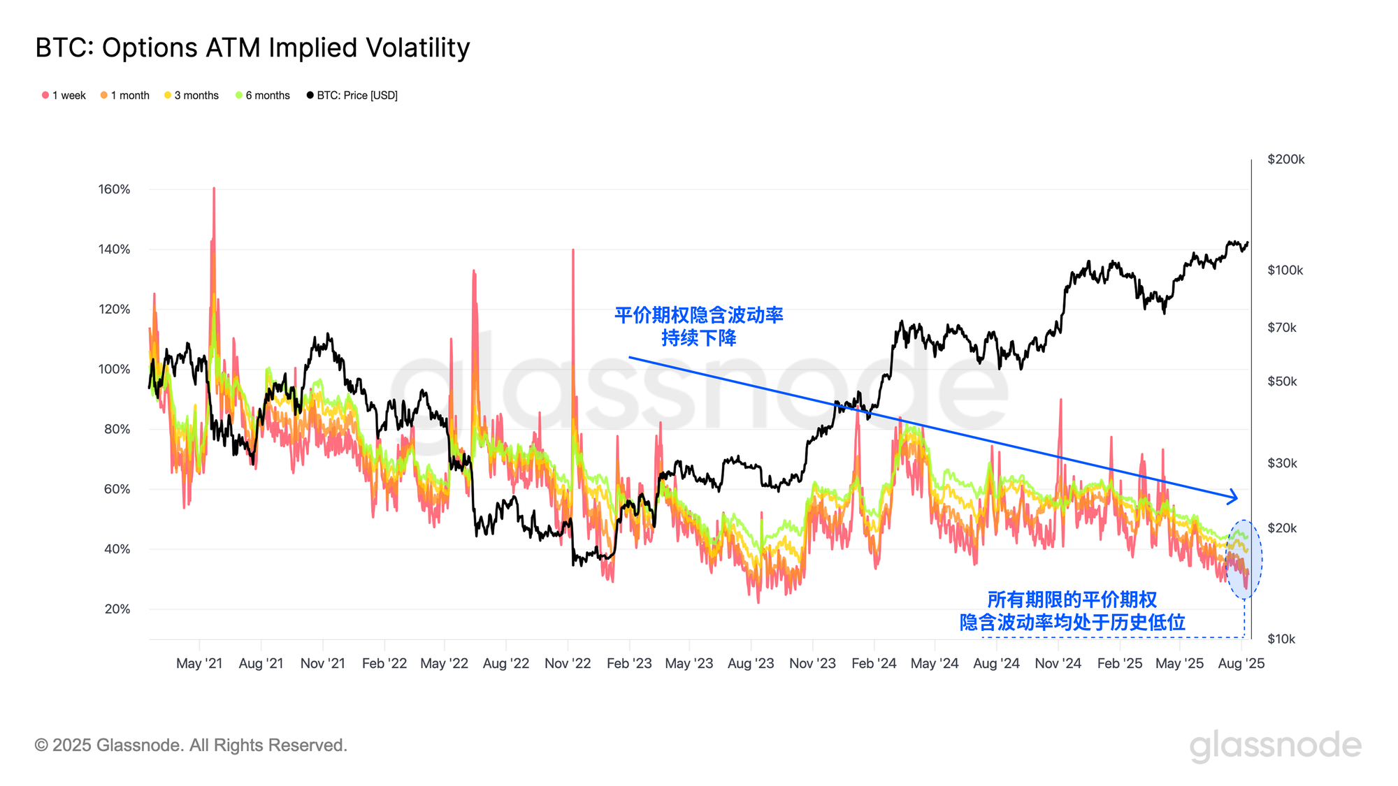 转向期权市场来看,平值期权的隐含波动率(ATM IV)仍处于持续下行趋势,表明交易者尚未预期市场将转入高波动率阶段。从历史经验看,如此低迷的波动率预期往往发生在剧烈市场波动之前,因此具有一定的逆向信号价值。