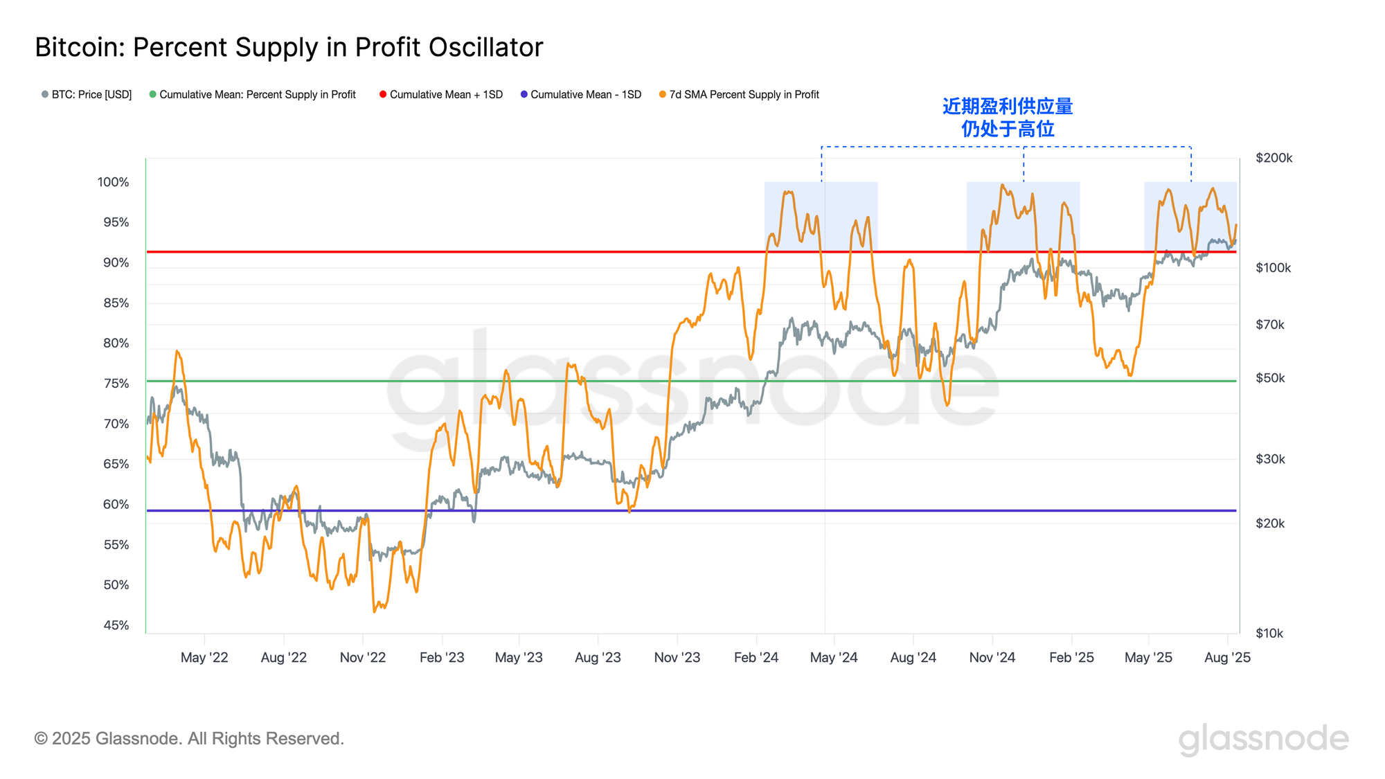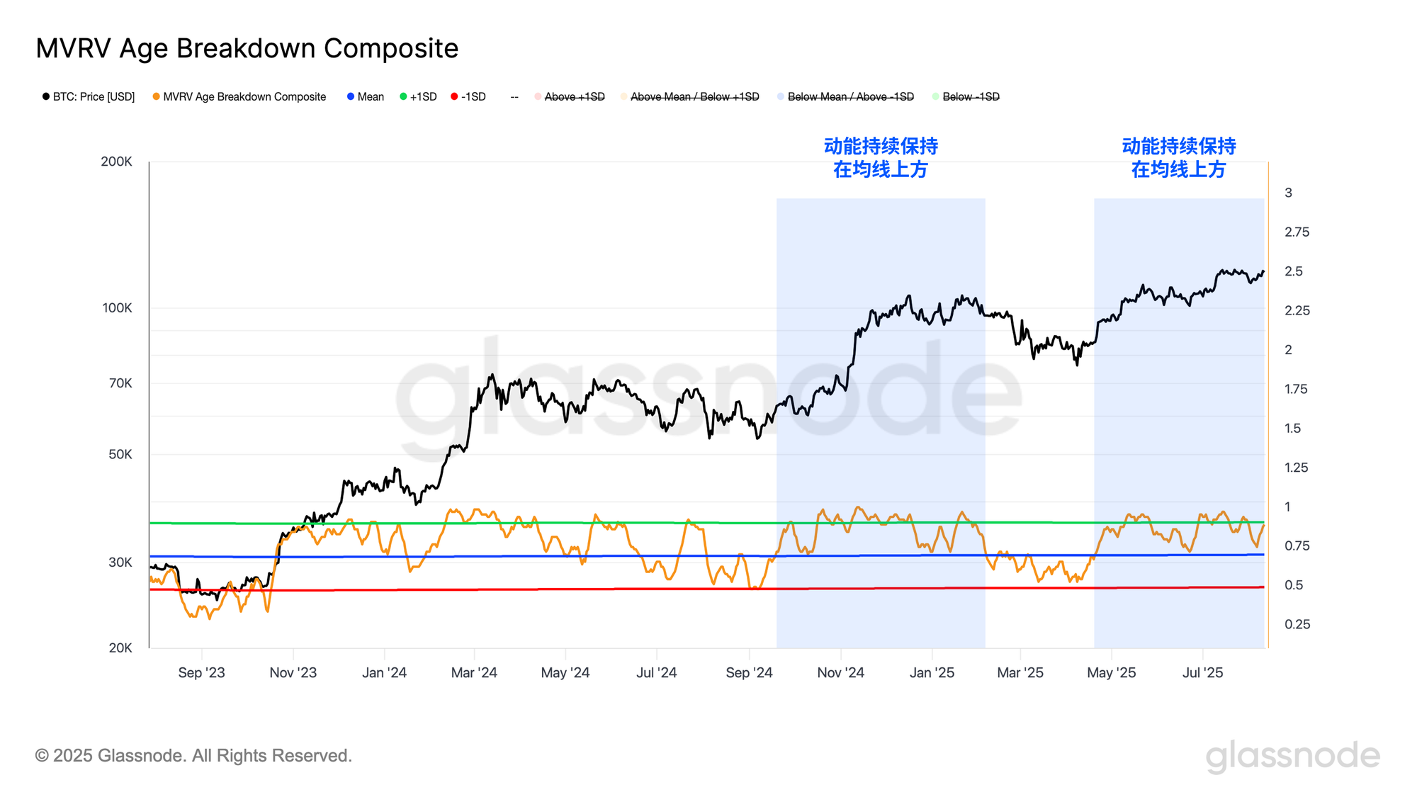 在最近的回调中,该震荡指标始终保持在其均值之上,并在该水平获得强劲支撑,说明大多数投资者在回调期间仍维持盈利状态。结合STH-SOPR指标所反映的有限亏损情况,这表明市场参与者几乎没有出现明显的恐慌性抛售压力。该关键支撑的守住,预示着市场状况正在改善,并为持续的上涨动能提供了积极背景。