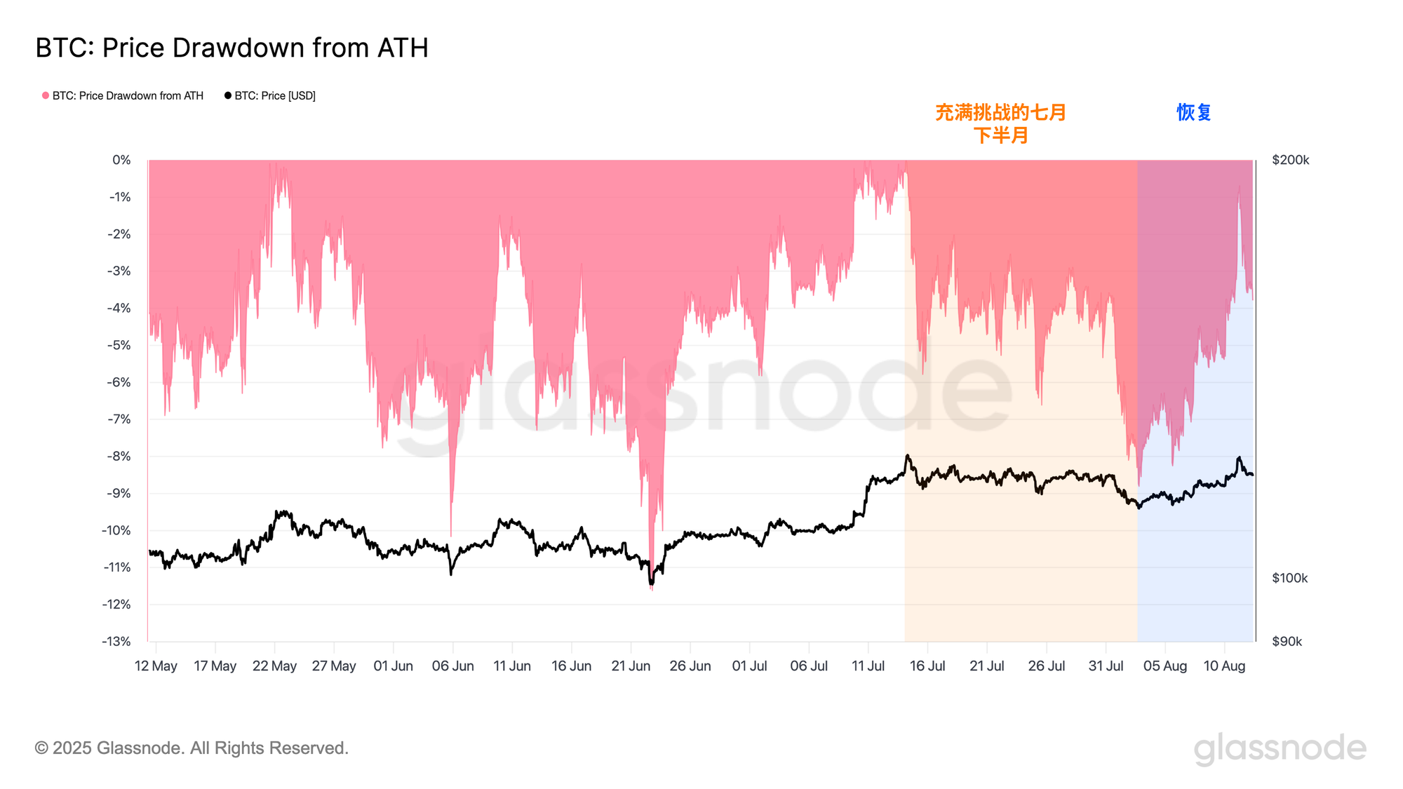 相比之下,在本轮周期中持续跑赢大多数山寨币的比特币,在7月下半月面临挑战,价格下跌至112,000美元,出现9%的回撤,进入《链上周报》第30期中所提到的低流动性“交易量断层”。此后,该资产强劲反弹,目前仅比历史高点低1%,表明市场正尝试重新进入价格探索的新阶段。