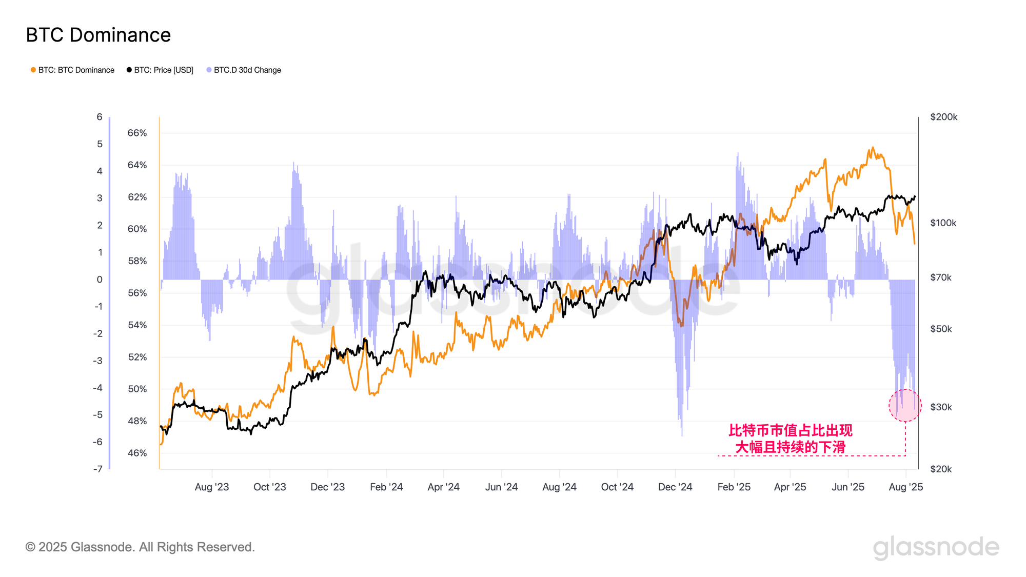 这种资金轮动也体现在比特币主导率指标中,该指标追踪比特币在整个数字资产市值中的占比。过去两个月内,比特币主导率从65%下降至59%,突显出资金正持续转向更高风险的资产。