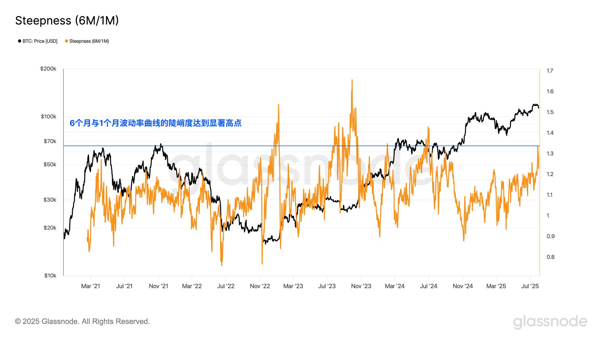 此外,我们还可以追踪6个月/1个月隐含波动率(IV)比值,以评估市场对不同时间段风险预期的变化。该斜率的变化可揭示交易者是否认为风险集中在近期,或是逐步向远期积聚,从而帮助识别市场情绪的变化及潜在压力或狂热的时间窗口。