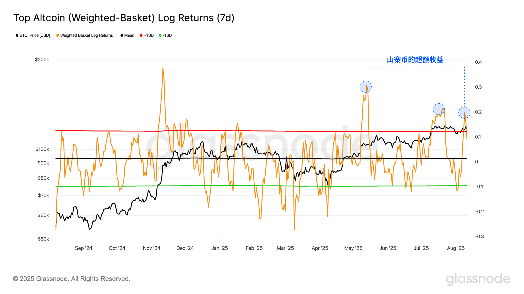 通过对收益序列应用 ±1σ 区间,我们可以识别出统计上显著的超额或低于平均表现的时期。在过去四个月中,这一方法揭示了三段持续性的强劲表现期,突显了山寨币板块的超额收益。