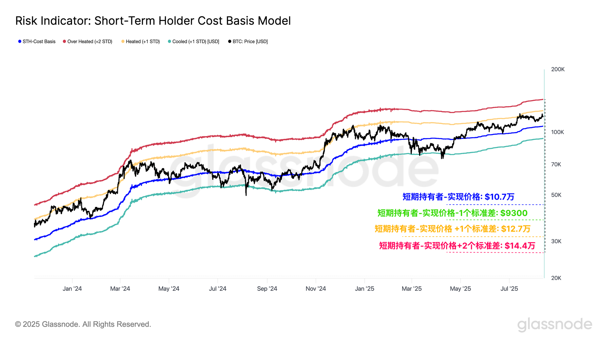 相反,对于比特币来说,我们可以参考短期持有者(STH)的成本价,即新进市场参与者的平均买入价格,该关键价格水平在历史上常作为局部牛熊格局的分水岭。若结合统计背景,我们可以围绕该水平应用标准差区间,以评估市场当前是否处于过热或过冷状态。