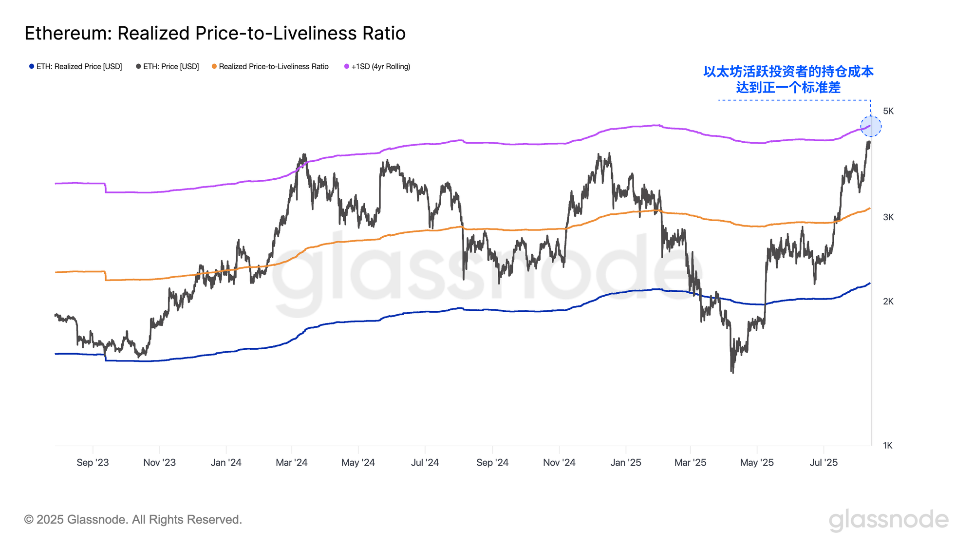 为了评估以太坊当前反弹的潜在上行目标,一个有用的参考点是其活跃已实现价格的+1标准差水平,该位置常常标志着抛压的开始。目前,这一门槛位于4,700美元,在当前市场条件下,可能构成一个过热区域。