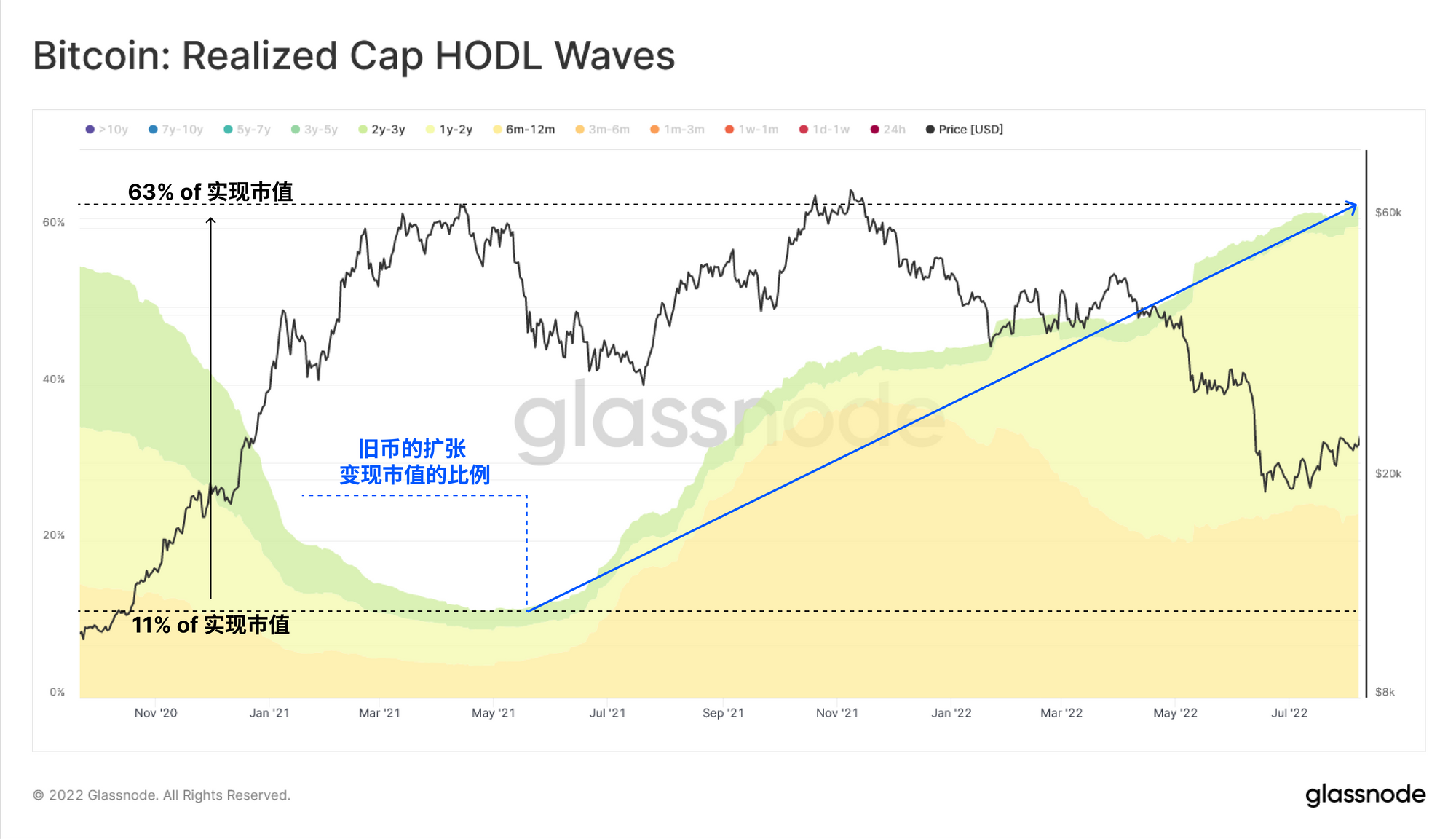 然后,可以用 "已实现市值 "的囤币波来评估在这些相同年龄段中持有的美元财富。我们可以发现一个更耐人寻味的结果,在这些群组中持有的总体美元价值已经激增了52%,现在占到已实现上限的63%。