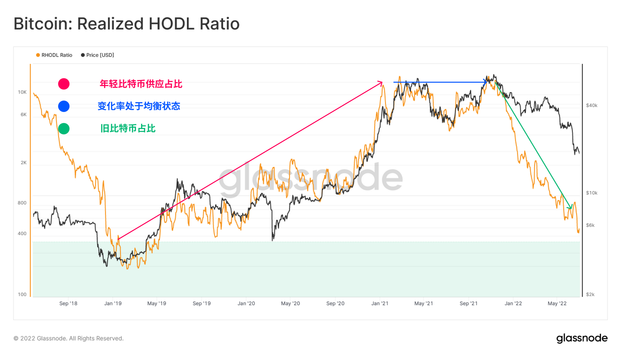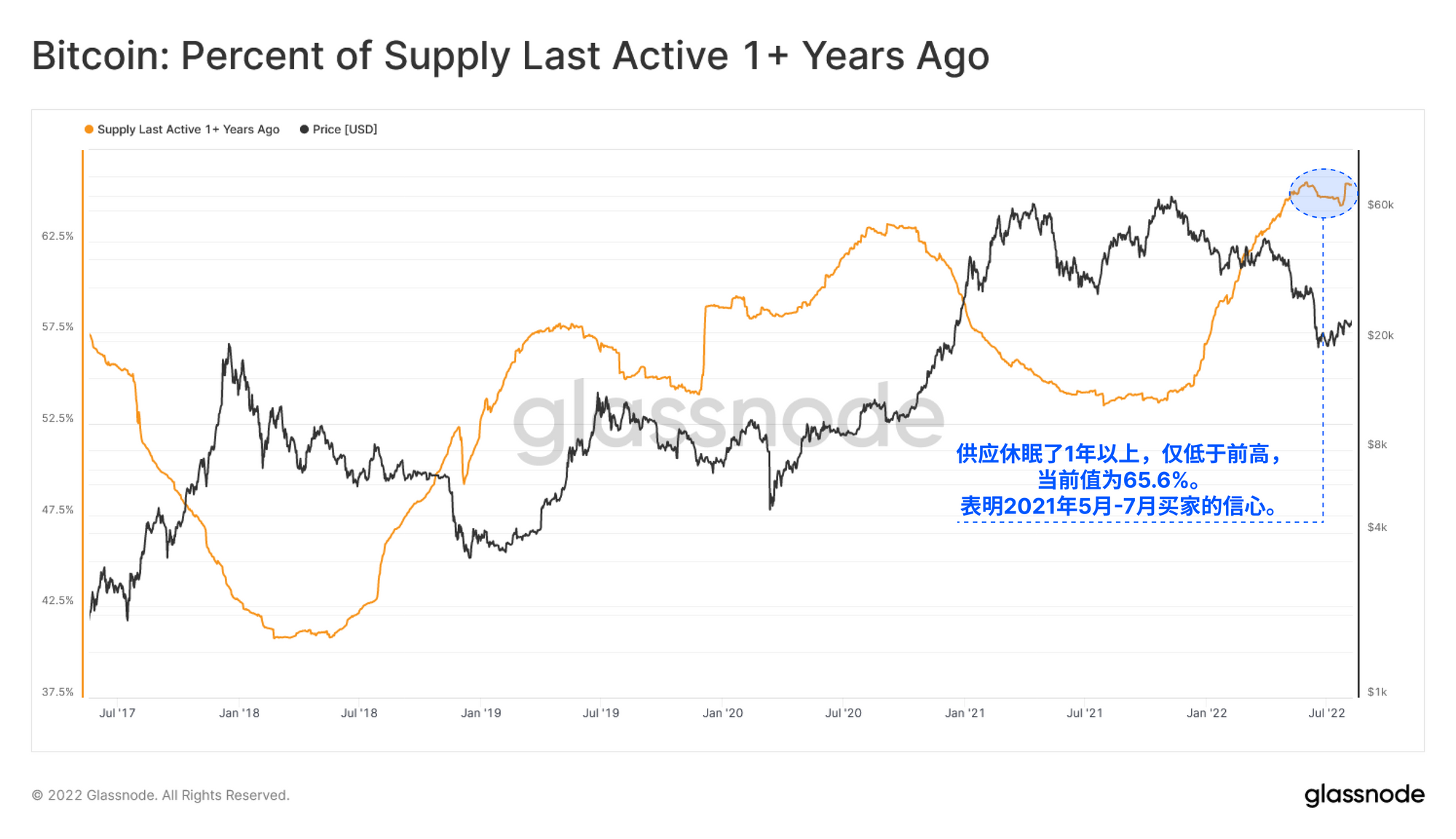- 我们用这种持续的增长来突出那些对价格不敏感的聪明的钱群组,这些群组有最小的卖出,投资者不管价格是否升值(2021年11月),也不关心随后的投降(2022年5月 - 目前),持币不动,等待持有的比特币成熟。