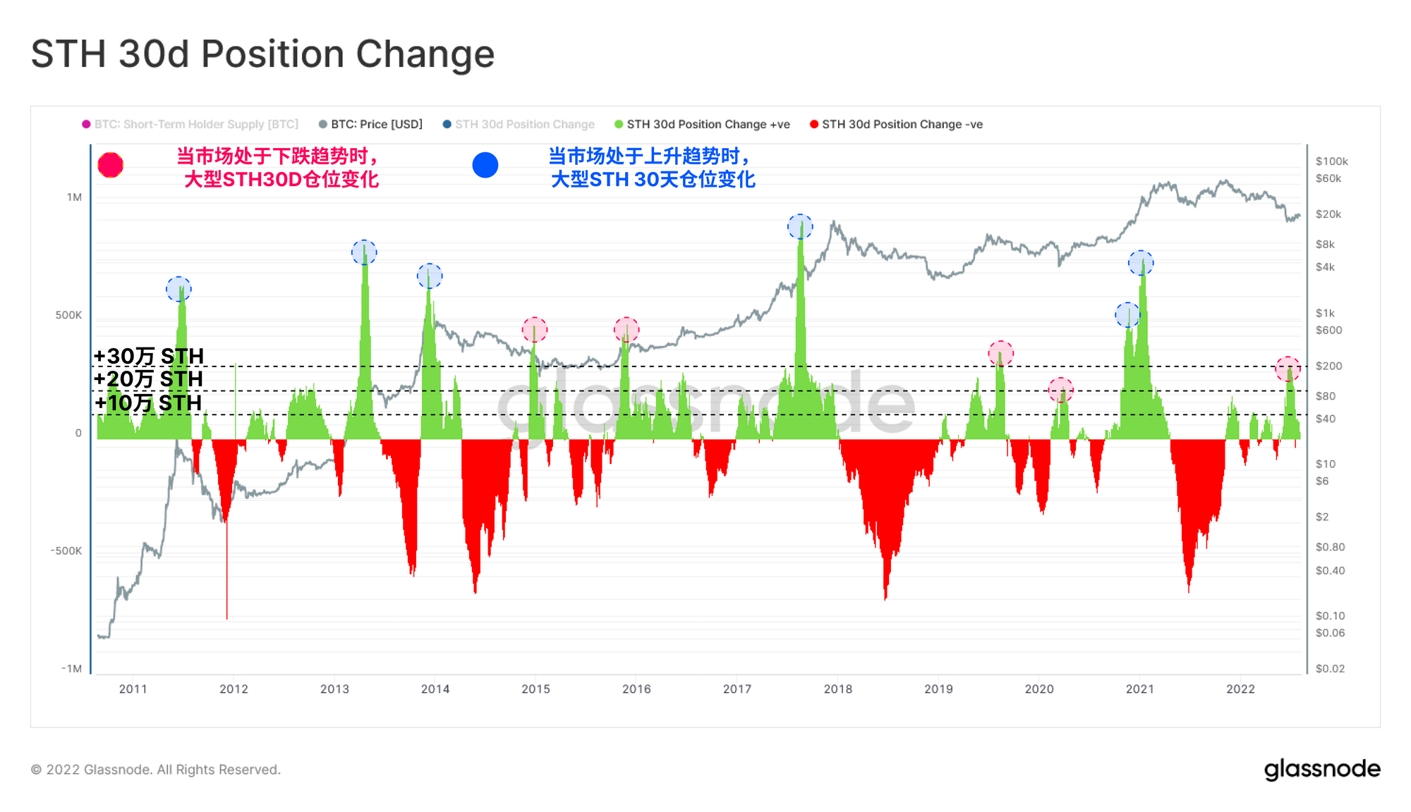 极端的STH积累通常与牛市见顶的形式同时出现(颜色标注为🔵),然而,有几个熊市的例子与这个趋势相反(颜色标注为🔴)。