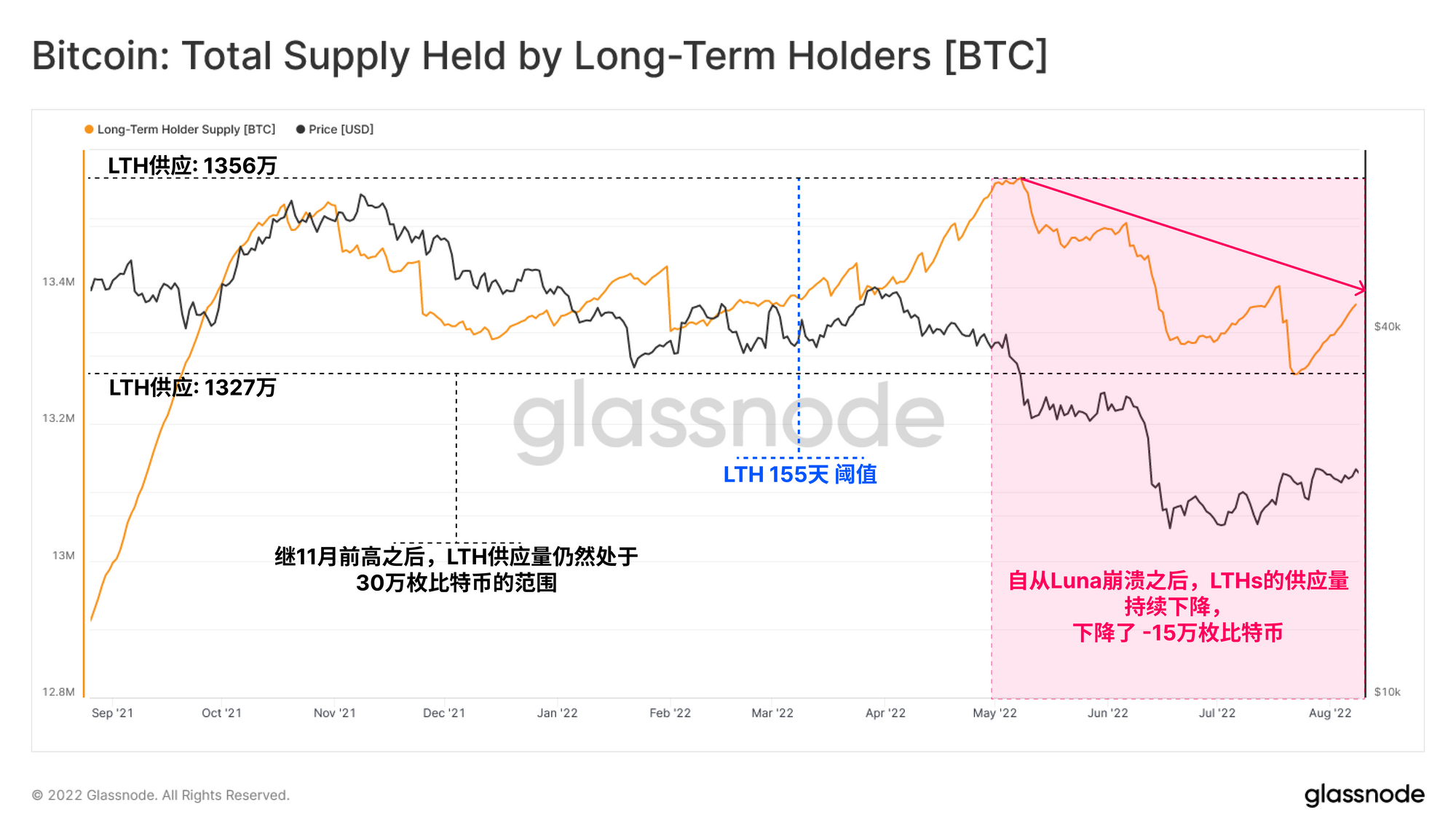 - 自2021年11月历史前高以来,LTH供应一直在1356万至1327万枚比特币之间 ,仅下降了30万枚比特币。