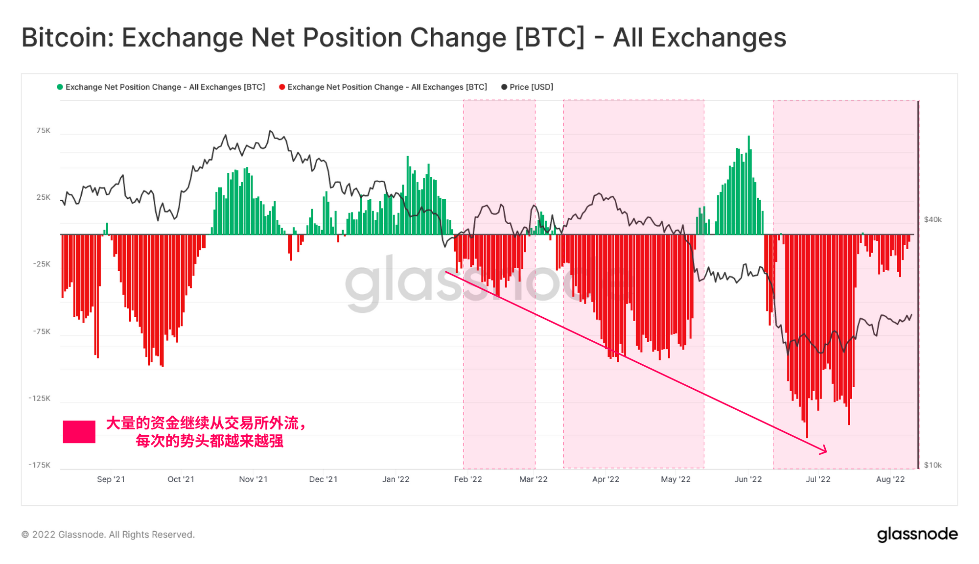 总的来说,在2022年5月LUNA投降后,交易所出现了-10万枚比特币的净流出,占2020年3月历史前高以来总流出量的3.2%。