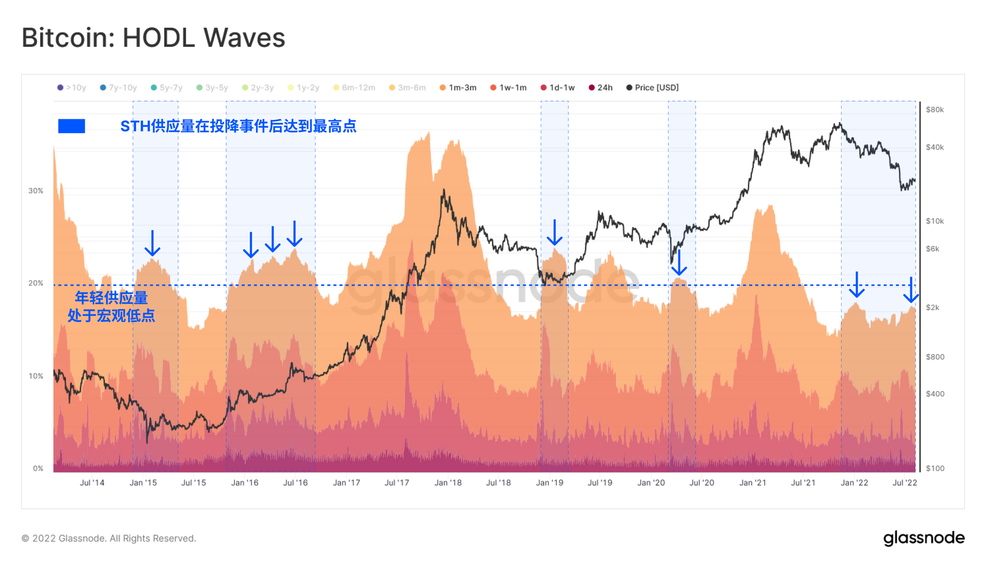 根据定义,这些比特币被转移到短期持有者群中。自2020年3月8日LUNA崩溃以来,STH供应增加了+33万枚比特币。