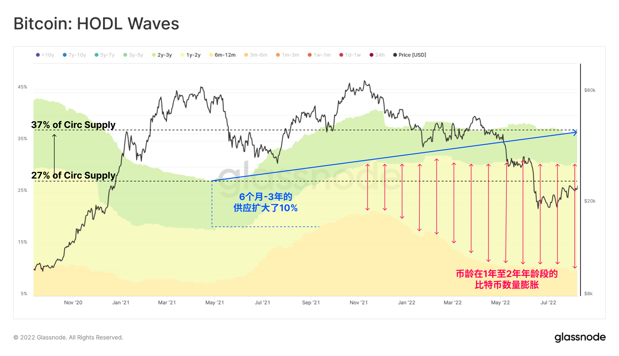 在矿工大迁徙之后,我们发现币龄在6个月至12个月区间发生了扩大,因为囤币党拒绝在低点卖出,这种供应膨胀与1年多前的供应活跃的底部相吻合。在囤币党主导的规则下,供应能够逐渐成熟,导致在2021年11月的历史前高之后,1年-2年的币龄带膨胀。