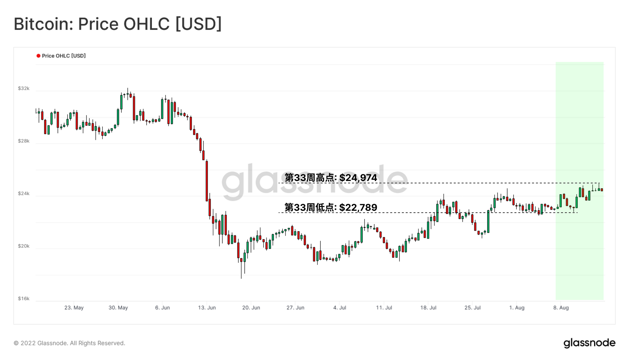 鉴于通胀的减速,比特币市场继续其最近的反弹,与其他风险资产一起走高。比特币价格继续在区间内盘整,但价格从22789美元的低点上升到24974美元的高点。