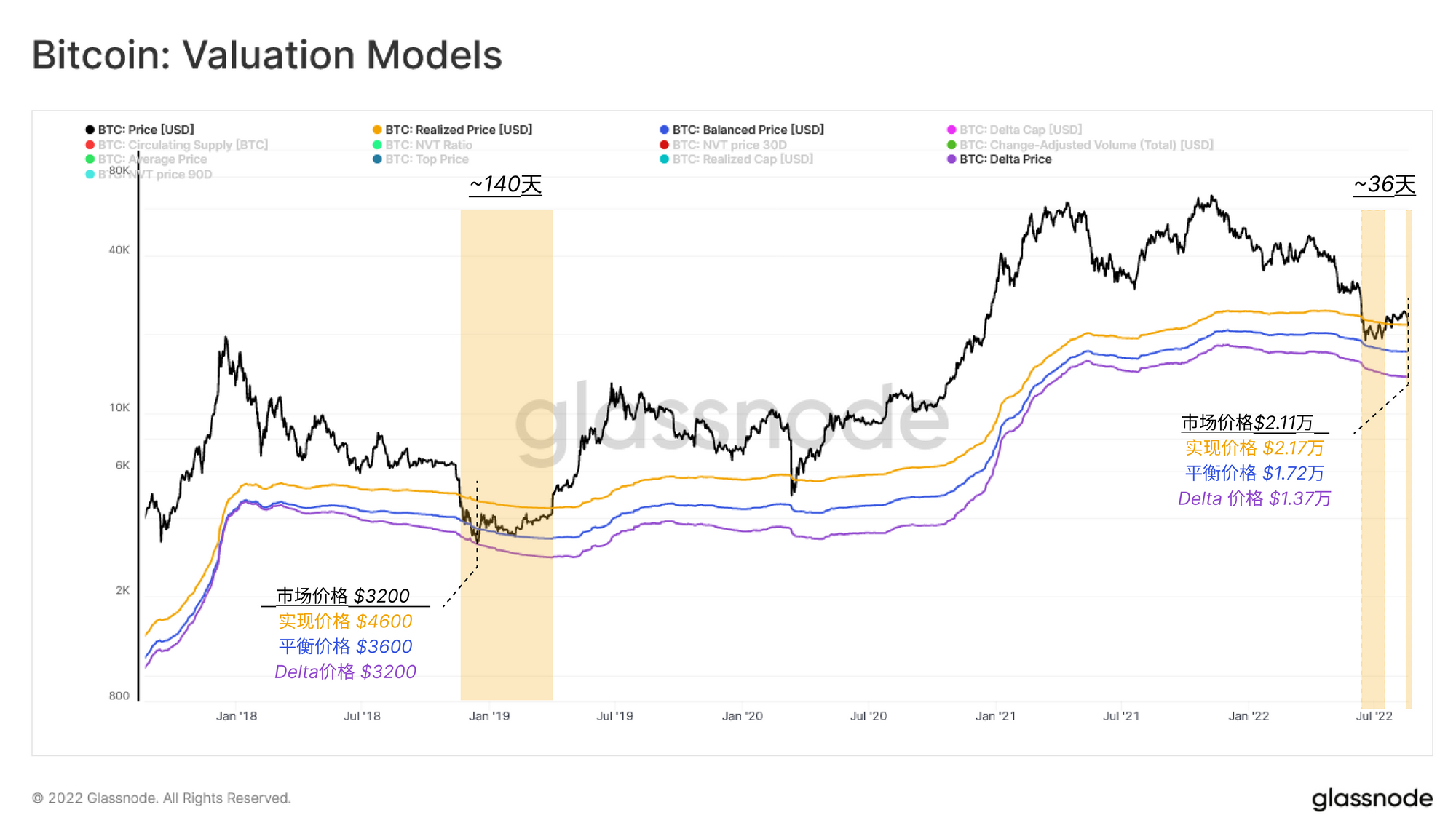随着实现价格高于现货价格,另外两个链上价格模型目前低于现货价格,它们可以做为潜在的价格支持水平。Delta Price 和 Balanced Price 是著名的链上模型,有在周期底部附近与价格趋同的记录。