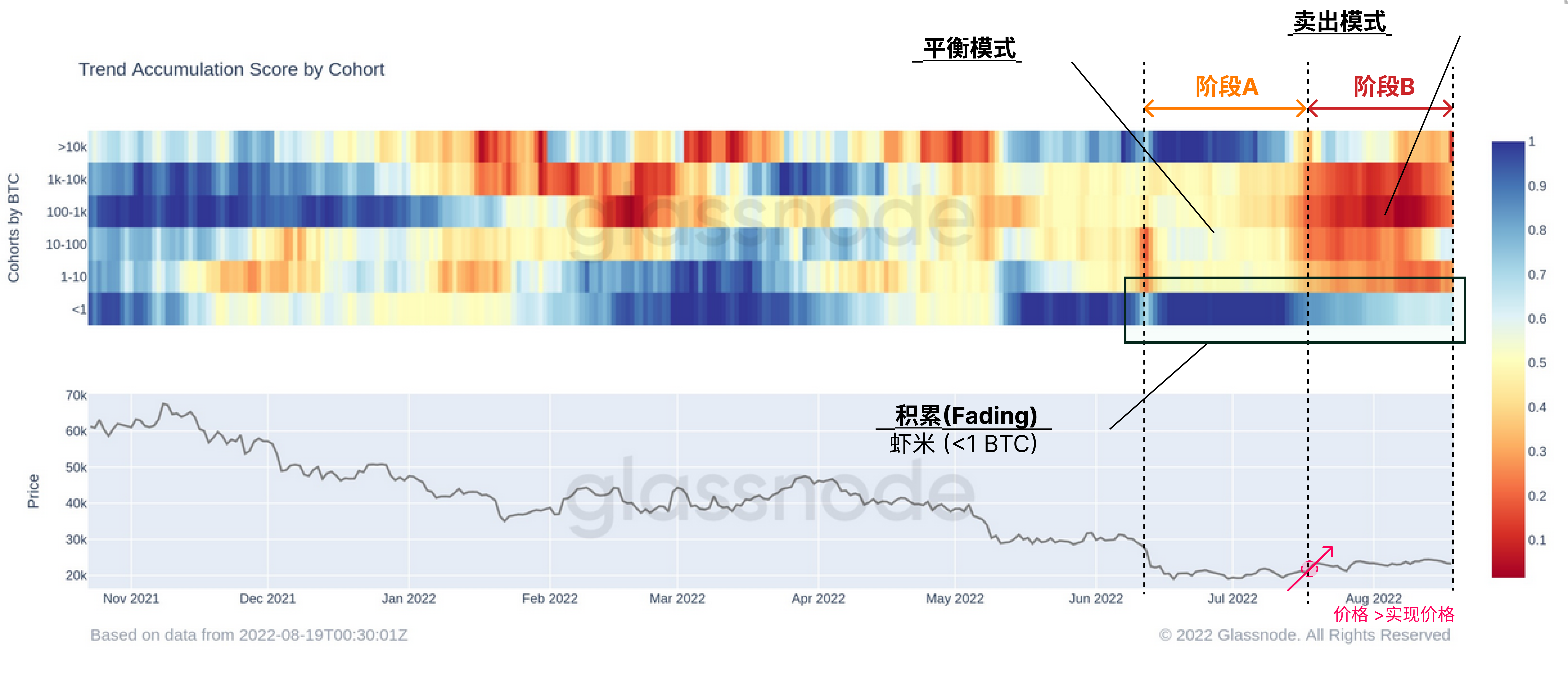 - B阶段🔴:在实现价格的初步开垦之后,所有的群体都抓住了机会,卖出他们的比特币。有趣的是虾米持续强劲的积累势头(<1 BTC)在这个阶段也有所减弱。