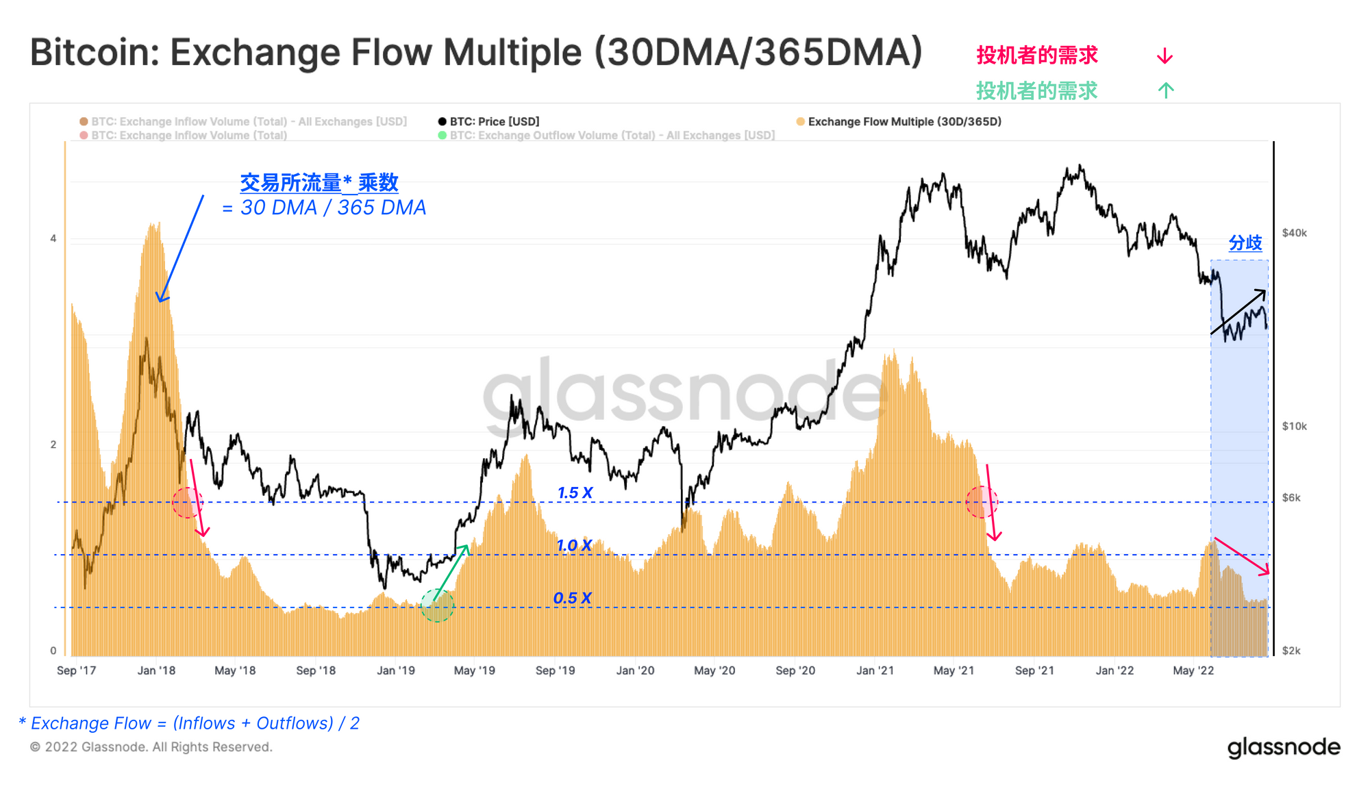 为了在交易所流量和更广泛的市场情绪之间建立一个明确的指标,我们定义了一个新的指标,交易所流量倍数。这个指标等于交易所月平均流量与其年平均值之间的比率。