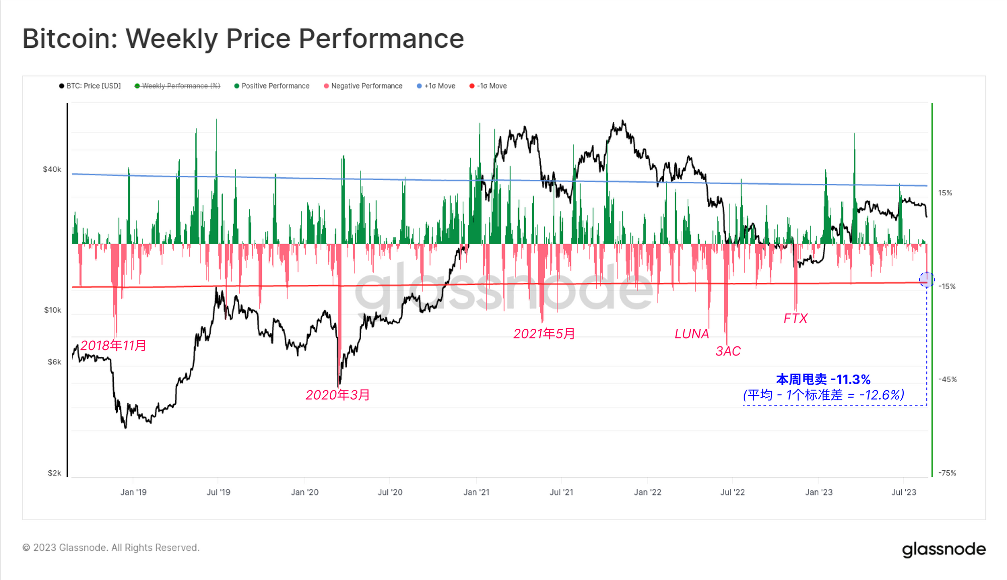 周价格走势下跌了-11.3%,跌幅较大,但并不是近年来最大的一次。这一表现略低于-12.6%的长期一个标准差波动,而这一水平在FTX、3AC和LUNA的崩溃等重大投降事件中都曾被突破。