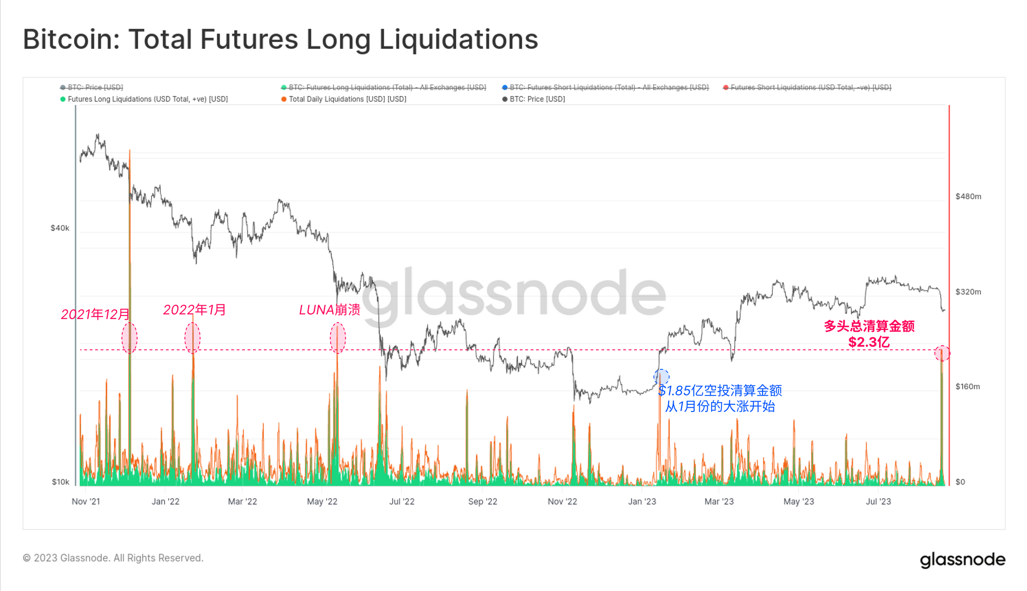 在几个小时内,多达 2.3 亿美元的多头合约被迅速清算,这是自2022年5月LUNA 崩溃后的最大清仓活动。这次清仓事件的规模超过了2023 年1月拉开反弹序幕的空头挤压,表明它可能具有改变趋势的潜力。