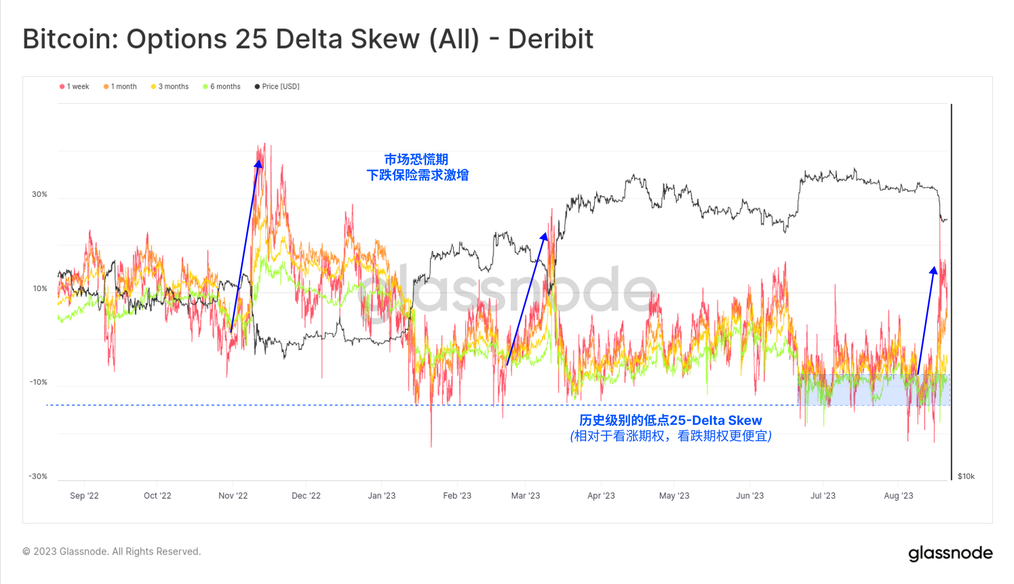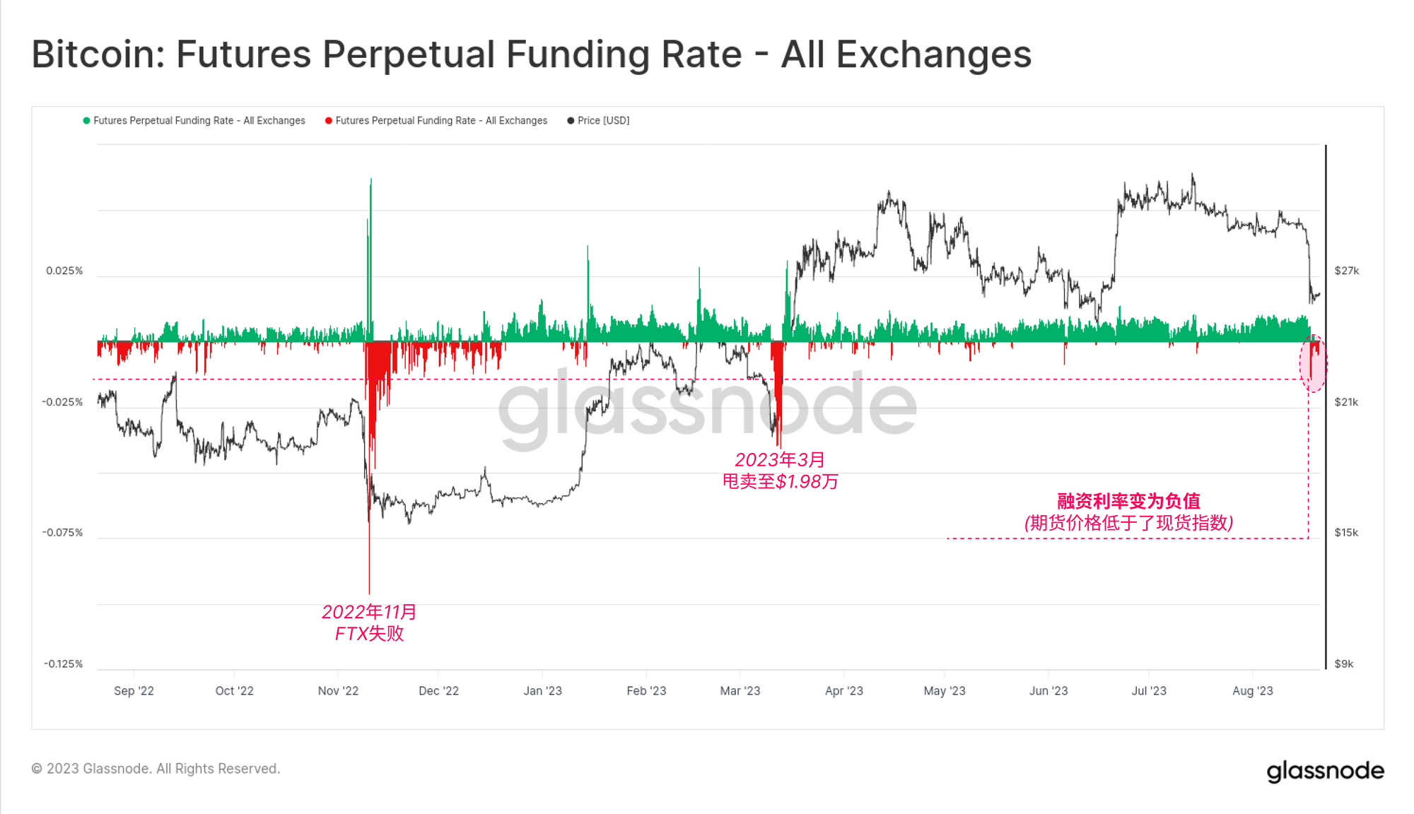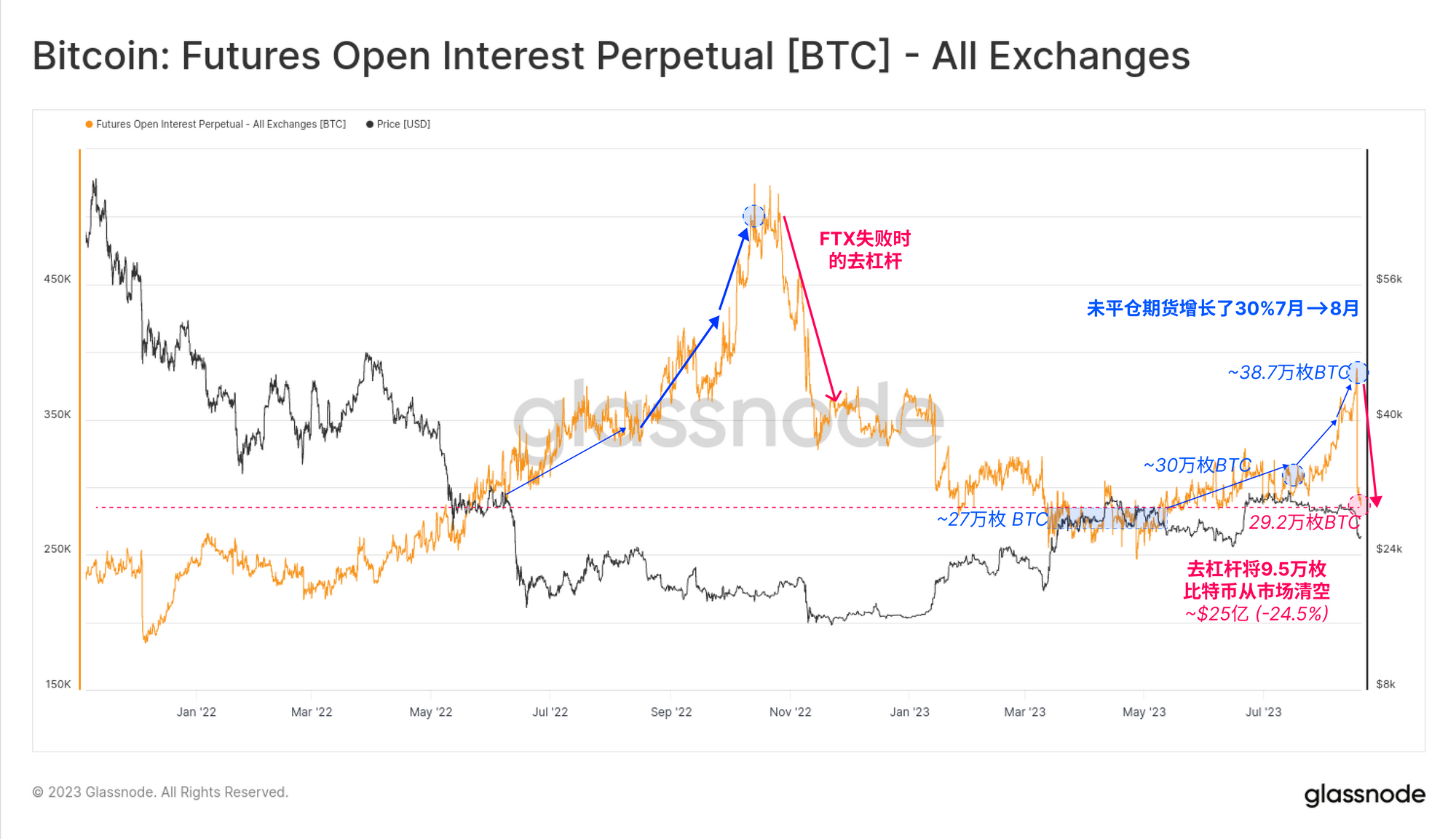 与期权市场的稳定相对,期货交易者这次遭受了巨大的去杠杆打击,这与 FTX 曾经的闪崩有许多相似之处。尽管整体规模不算太大,但在短短一天内,有超过25亿美元的永续期货合约被迫平仓。这代表了一个惊人的 -24.5%的下跌,相当于7-8 月份的所有增加杠杆被完全抹去。